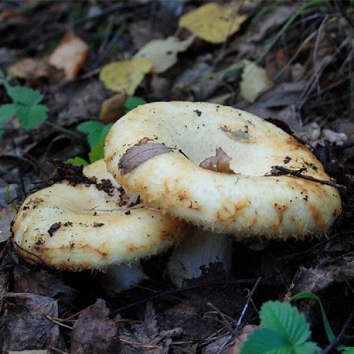 Груздь сизоватый . Условно-съедобный гриб . Шляпка белая, сухая, иногда немного бархатистая . Цвет пластинок белый или кремовый . Ножка довольно высокая - до 9 см, к основанию сужается .