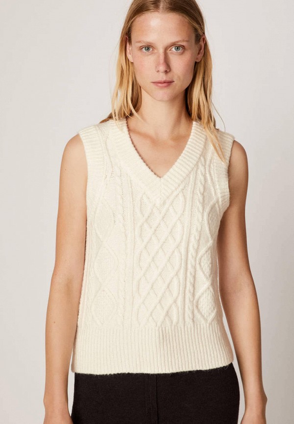 моложежный длинный белый жилет, связанный спицами, на блондинке . Молодежные женские жилеты не любят нагромождение кос и аранов . Подобные узоры ассоциируются со зрелостью, серьёзностью .