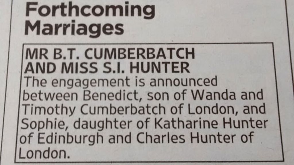 Total . Jul 2014 - present . 7 years, 2 months . After a year of dating , Benedict Cumberbatch's engagement to girlfriend Sophie Hunter, whom he has known for 17 years, has been announced with a notice in The Times newspaper . The small notice appeared under "forthcoming marriages" on page 57 of Wednesday's (5 November 2014) publication .