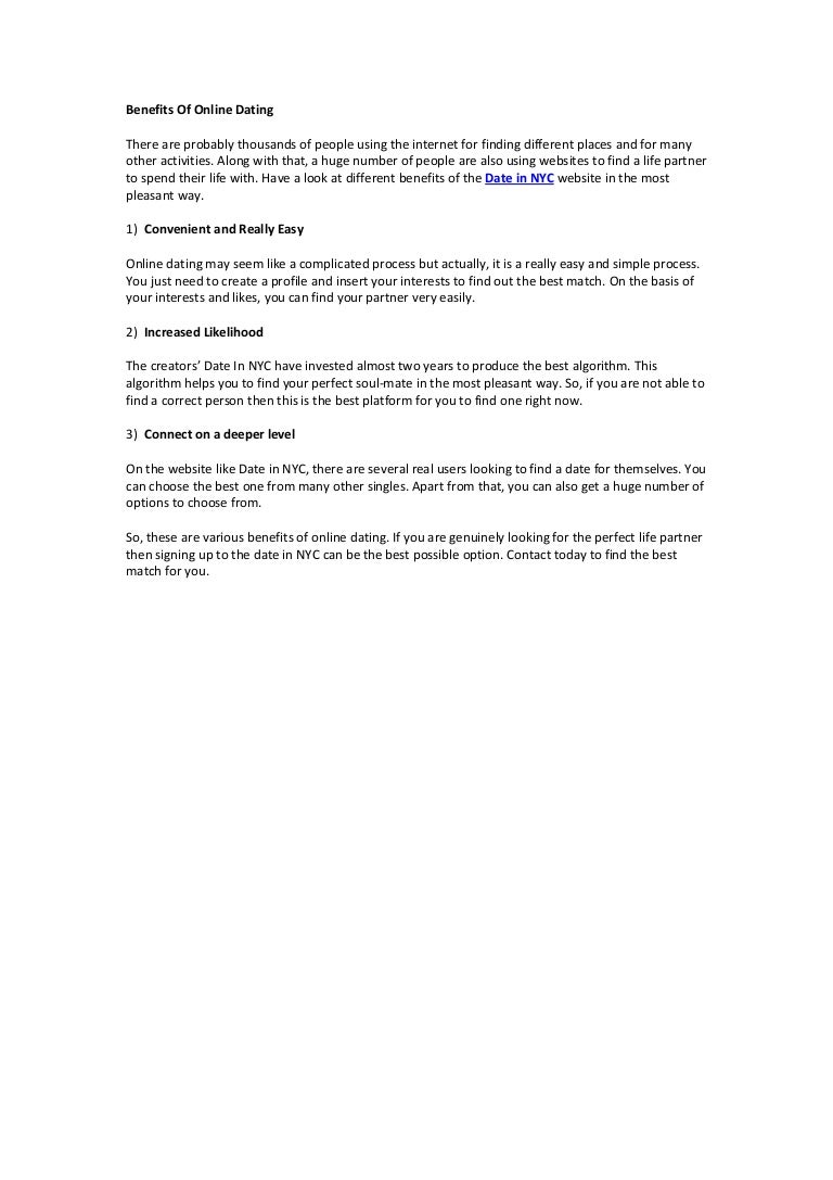 One of the benefits of online dating is that it provides a secure space to get to know the other person without the tense atmosphere of a first date . 2 . It increases the probability of finding your match