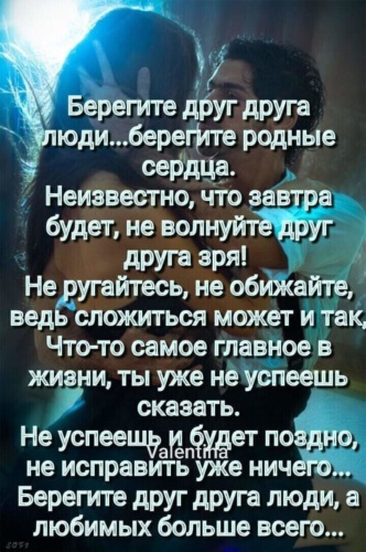 Берегите друг друга люди . берегите родные сердца . неизвестно что завтра будет . не волнуйте друг друга зря . не ругайтесь, не обижайте . ведь сложиться может и так . что-то самое главное в жизни . ты уже не успеешь сказать .