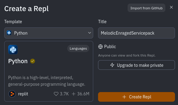 2) Нажимаем + Create Repl и в темплейтах выбираем Python