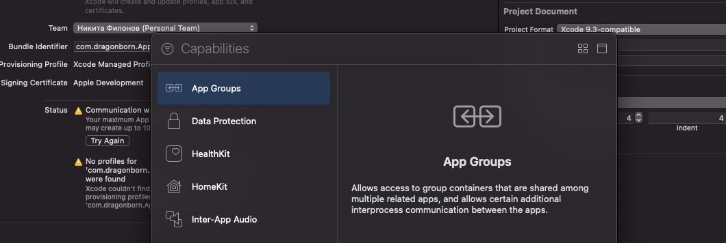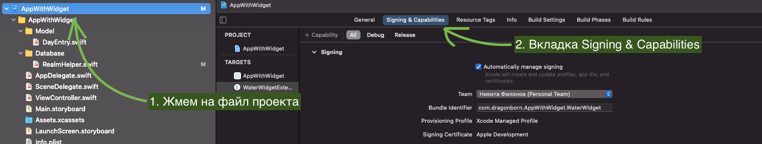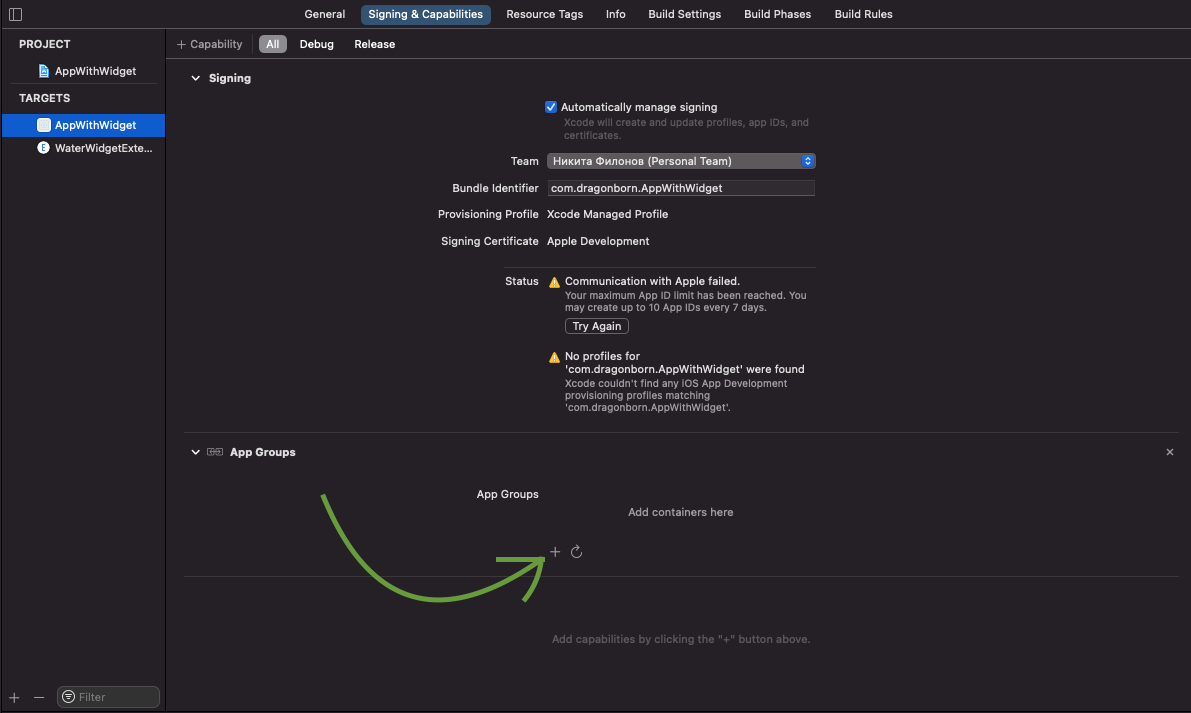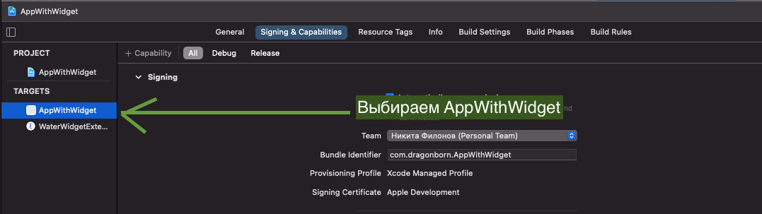 Под надписью Signing & Capabilities находим + Capability, жмем и выбираем AppGroup:
