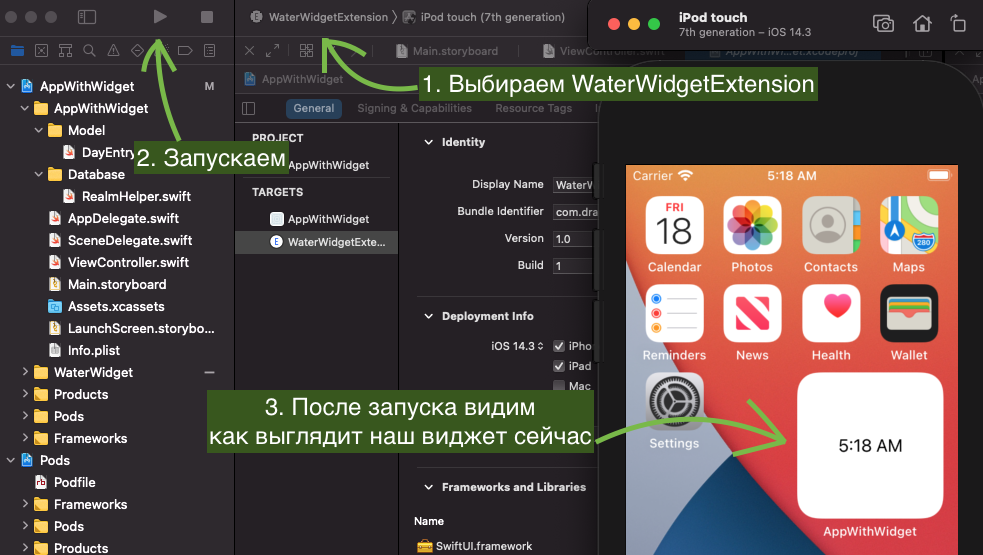 Чуть отмотаем время назад и вспомним, что, когда мы запускали виджет на симуляторе, мы меняли target перед запуском.