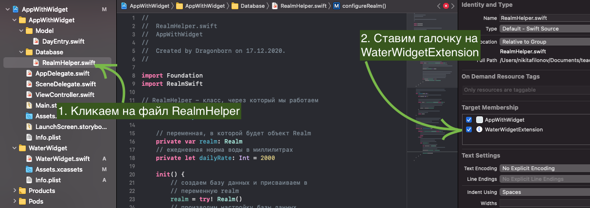 Чтобы виджет отображал данные, которые мы заносим в Realm через приложение - и приложение и виджет должны работать с одним файлом.
