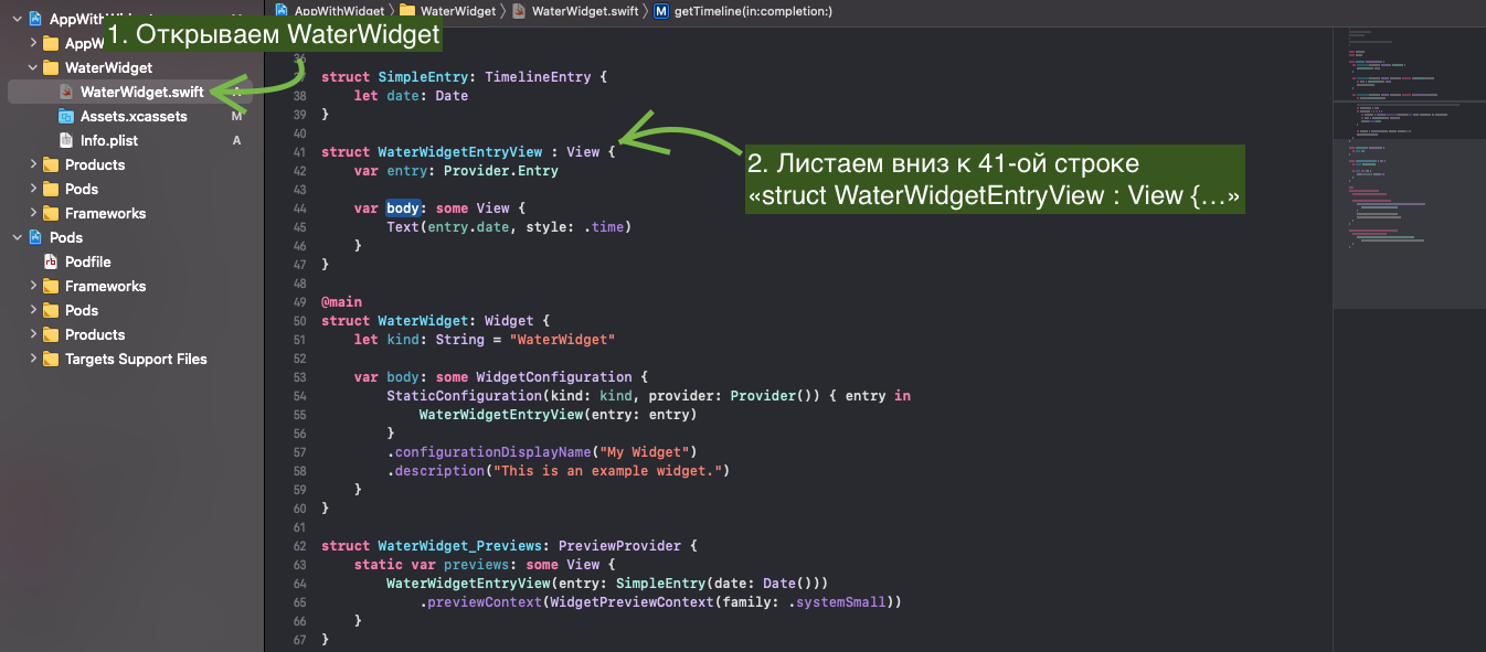 Нас интересует файл WaterWidget.swift.