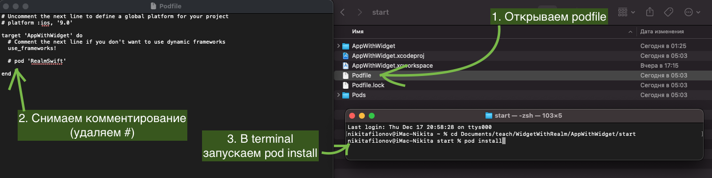 - Снимаем комментарий с pod 'RealmSwift'.