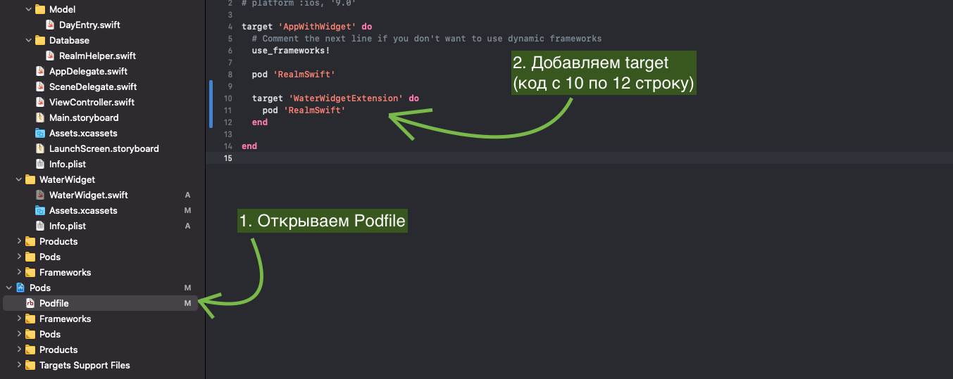 В Podfile прописываем отдельную установку Realm'a для виджета.