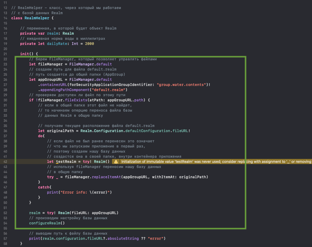 - Создаем путь до default.realm в общей папке (его там может и не быть, это именно путь в виде строки, точнее URL'a) и сохраняем его в appGroupURL.