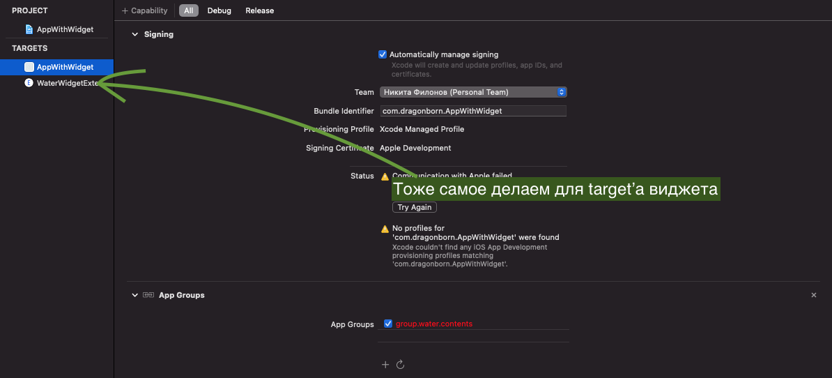 И все тоже самое проделываем для второго target'a (WaterWidgetExtension):