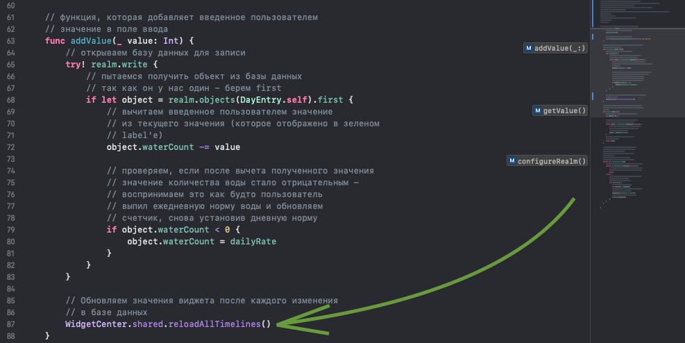 Когда мы меняем значение в RealmHelper'e в функции addValue(), в самом конце добавим WidgetCenter.shared.reloadAllTimelines() - эта команда будет обновлять виджет.