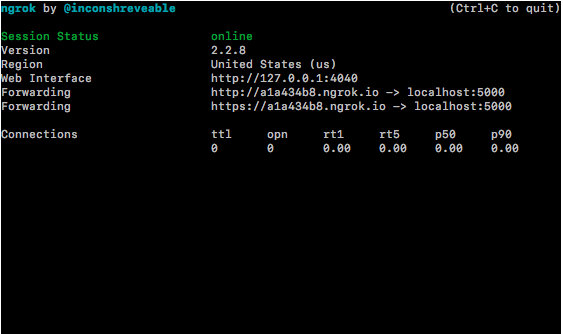 Но это выполняется локально, и API Telegram не может отправлять свои POST-запросы локальному URL-адресу. Следовательно, мы будем использовать ngrok, чтобы сделать локальный сервер доступным в интернет.