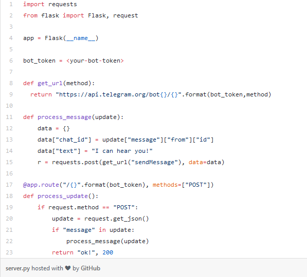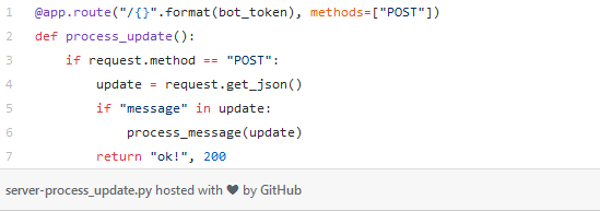 Функция process_update()и декоратор: когда кто-кто-нибудь будет отправлять в POST - домен http://127.0.0.1:5000/<your-bot-token>, мы будем извлекаем из него JSON - данные. Если это обычное текстовое сообщение, оно будет иметь ключ message в JSON. Проверяем, и если это нормальное сообщение, мы отвечаем с помощью process_message(update)