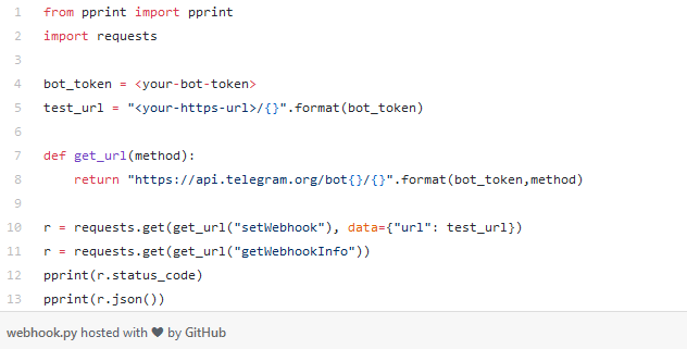 pprint позволит напечатать хорошо отформатированные данные JSON. Отправляем URL-адрес web-hook в виде запроса POST на setWebhook API Telegram. Теперь запускайте следующие строки в командной строке: