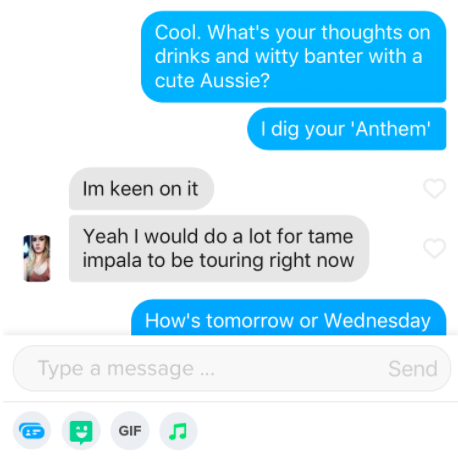If you want to make me swoon, send me the best animal GIF you can find ." "Be honest: Did you swipe right for me or my fur baby?" "What size bowling shoes should I get for you?