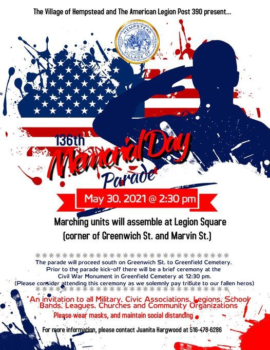 join us on May 30, 2021 at 2:30pm at Hempstead Legion Square at the Corner of Greenwich St. and Marvin St. so we can March and celebrate Memorial Day! For more information, please contact Juanita Hargwood at 516-478-62