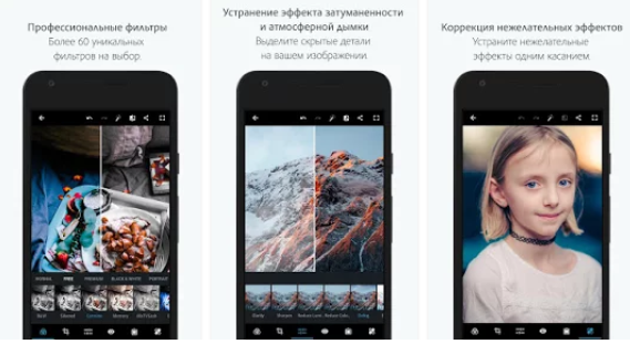1. Photoshop Express - Неплохой фоторедактор с базовым набором инструментов, удалением дефектов, поддержкой фильтров и RAW-формата. Для доступа ко всем функциям, необходима бесплатная регистрация в Adobe ID.