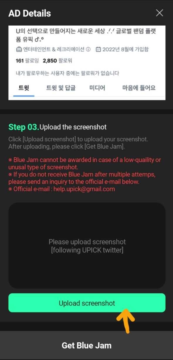 حالا برگردین توییتر و از بایوی upick که فالو کردین اسکرینشات بگیرین و توی این قسمت👇، آپلود کنین؛ قلب/الماسهای آبیتونو دریافت کنین.