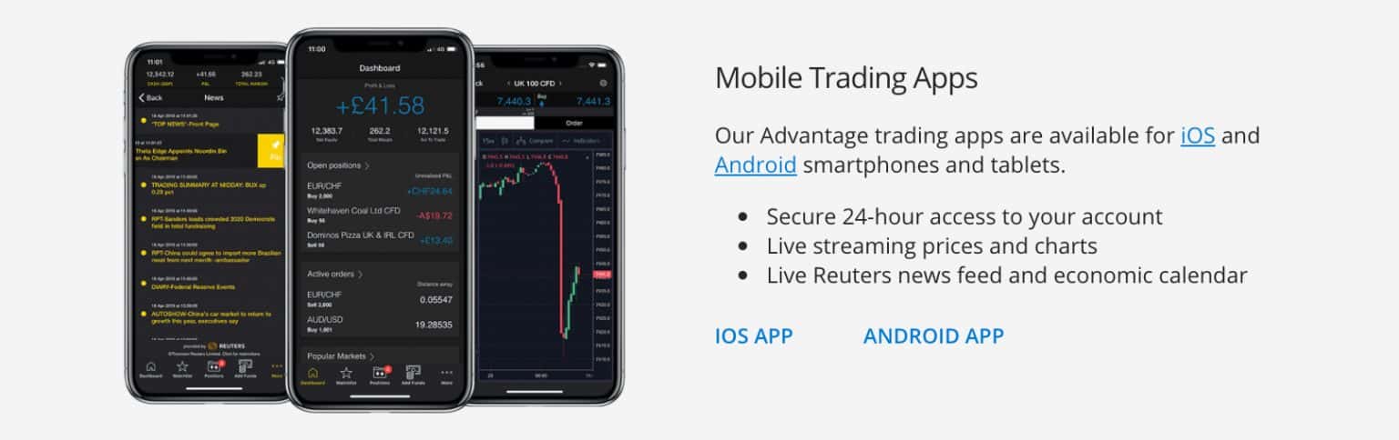 City Index offers two forex trading apps specifically designed for iOS and Android devices. Many of City Index’s web trader features are available on the mobile apps, including different order types such as GSLOs, one-click trading, Reuters news and custom indicators.