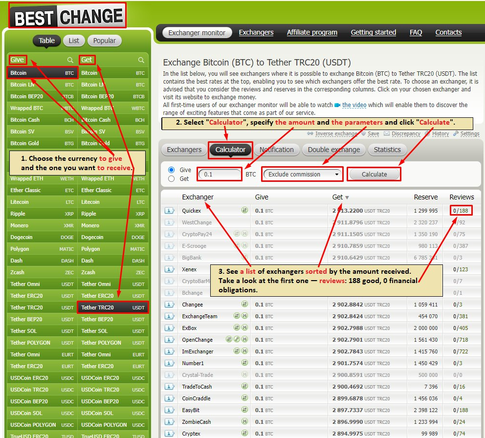 - choose an exchanger with suitable conditions and ensure this service possesses sufficient currency reserve to carry out the operation. Also, please take a look at the latest reviews of this exchanger to make sure it has no issues at the current moment;