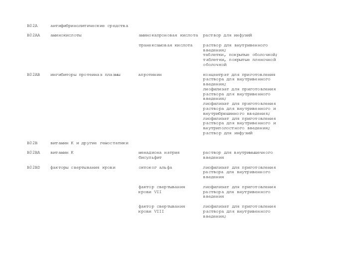 b02aa01 Аминокапроновая кислота . Аминокапроновая кислота . b02aa02 Транексамовая кислота . Транексамовая кислота . b02ab01 Апротинин . Апротинин . b02ab02 Альфа1 антитрипсин . Нет . b02ba01 Фитоменадион . Фитоменадион