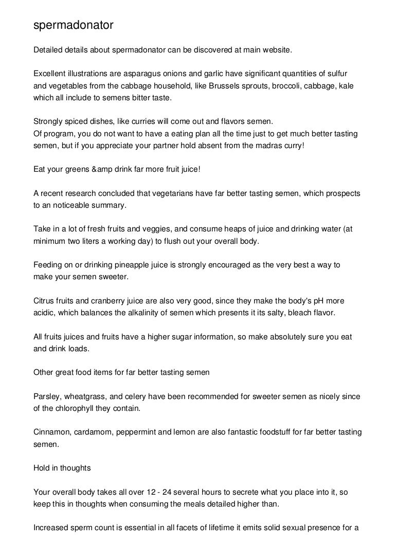"Alkalizing the body with things like wheatgrass shots, parsley, peppermint, and lemon can all help make your semen taste better . Pineapple juice and eating more fruits like apples, plums, cherries . . .