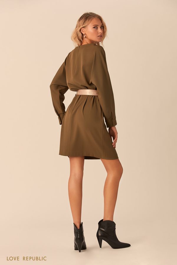 Бежевое платье-рубашка с рукавами-фонариками и пояс…