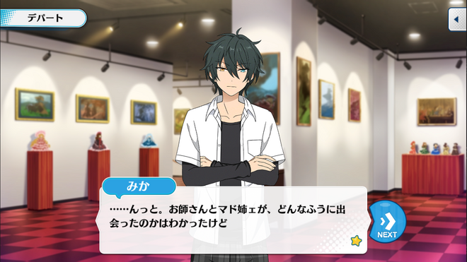 Мика: Ах, ладно. Мне интересно~ Нару-чан раньше разговаривала с человеком, который управляет выставкой.