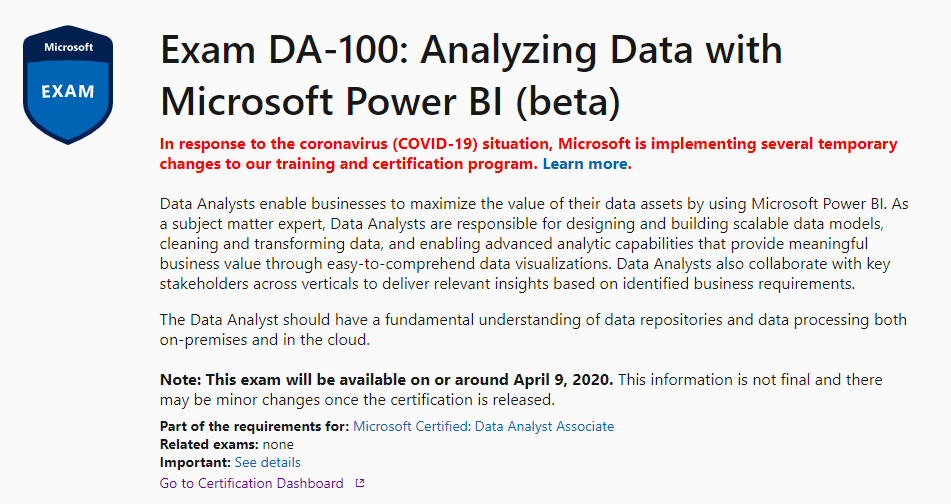 Exam DA-100 tests your knowledge of Microsoft's Power BI . Pass the exam to get the Microsoft Certified: Data Analyst Associate qualification . DA-100 was released on 2 April 2020 . As this is a brand-new exam in beta, Microsoft is offering 80% off the exam's regular price .