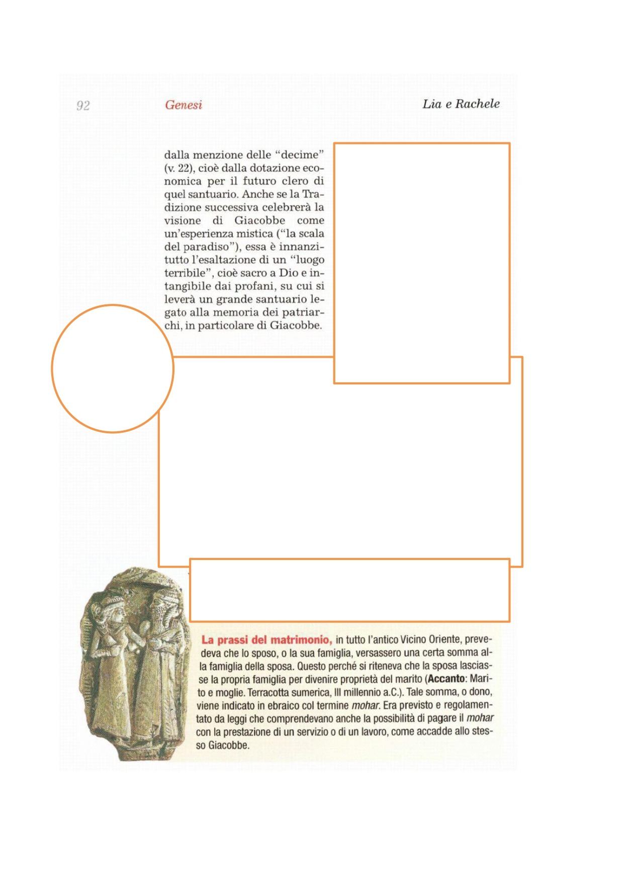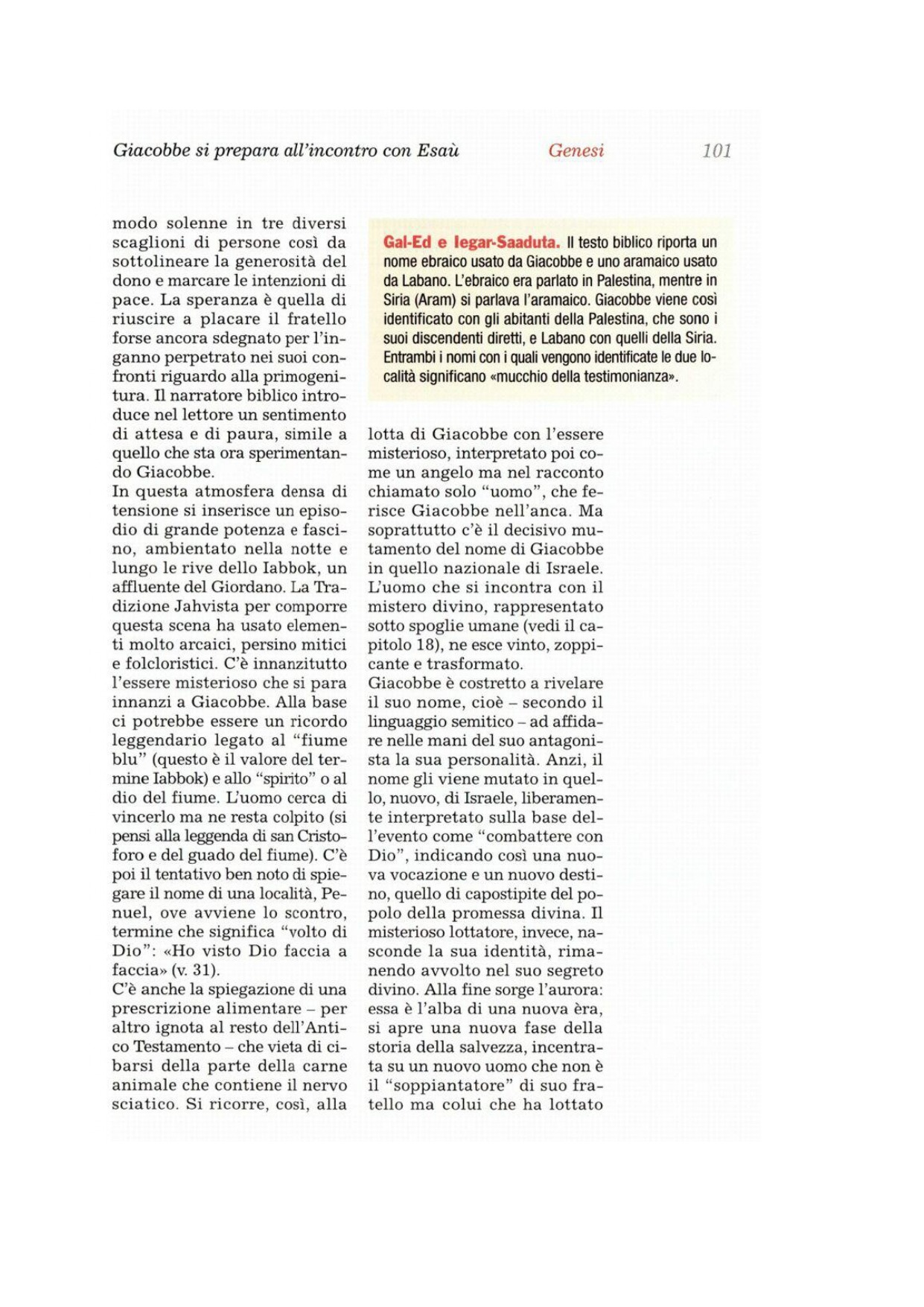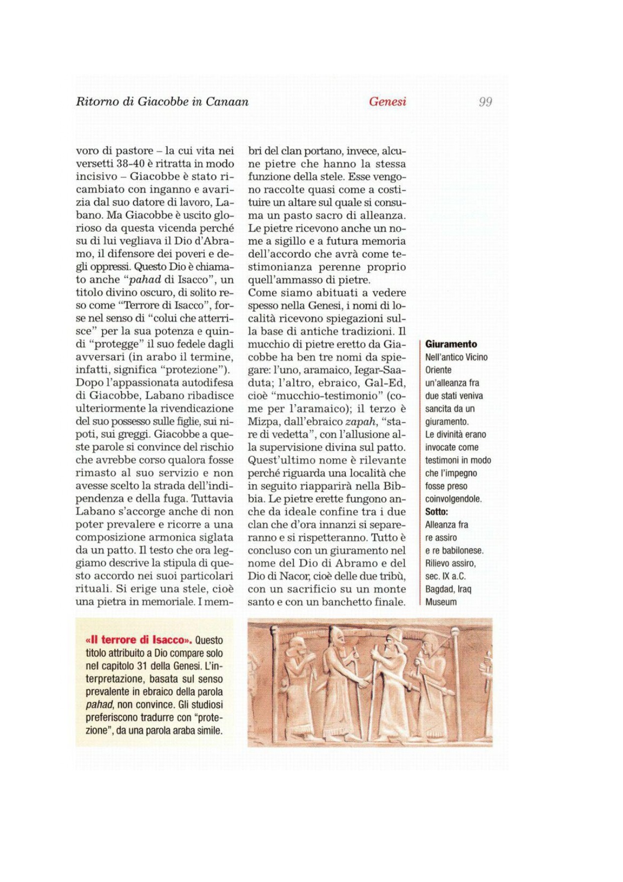 43Làbano allora rispose e disse a Giacobbe: «Queste figlie sono le mie figlie e questi figli sono i miei figli; questo bestiame è il mio bestiame e quanto tu vedi è mio. E che cosa potrei fare oggi a queste mie figlie o ai figli che hanno messo al mondo? 44Ebbene, vieni, concludiamo un'alleanza, io e te, e ci sia un testimone tra me e te». 45Giacobbe prese una pietra e la eresse come stele. 46Poi disse ai suoi parenti: «Raccogliete pietre», e quelli presero pietre e ne fecero un mucchio; e su quel mucchio mangiarono. 47Làbano lo chiamò Iegar-Saadutà, mentre Giacobbe lo chiamò Gal-Ed. 48Làbano disse: «Questo mucchio è oggi un testimone tra me e te»; per questo lo chiamò Gal-Ed 49e anche Mispa, perché disse: «Il Signore starà di vedetta tra me e te, quando noi non ci vedremo più l'un l'altro. 50Se tu maltratterai le mie figlie e se prenderai altre mogli oltre le mie figlie, sappi che non un uomo è con noi, ma Dio è testimone tra me e te». 51Soggiunse Làbano a Giacobbe: «Ecco questo mucchio ed ecco questa stele, che io ho eretto tra me e te. 52Questo mucchio è testimone e questa stele è testimone che io giuro di non oltrepassare questo mucchio dalla tua parte e che tu giuri di non oltrepassare questo mucchio e questa stele dalla mia parte, per fare il male. 53Il Dio di Abramo e il Dio di Nacor siano giudici tra di noi». Giacobbe giurò per il Terrore di Isacco suo padre. 54Poi offrì un sacrificio sulle montagne e invitò i suoi parenti a prender cibo. Essi mangiarono e passarono la notte sulle montagne.