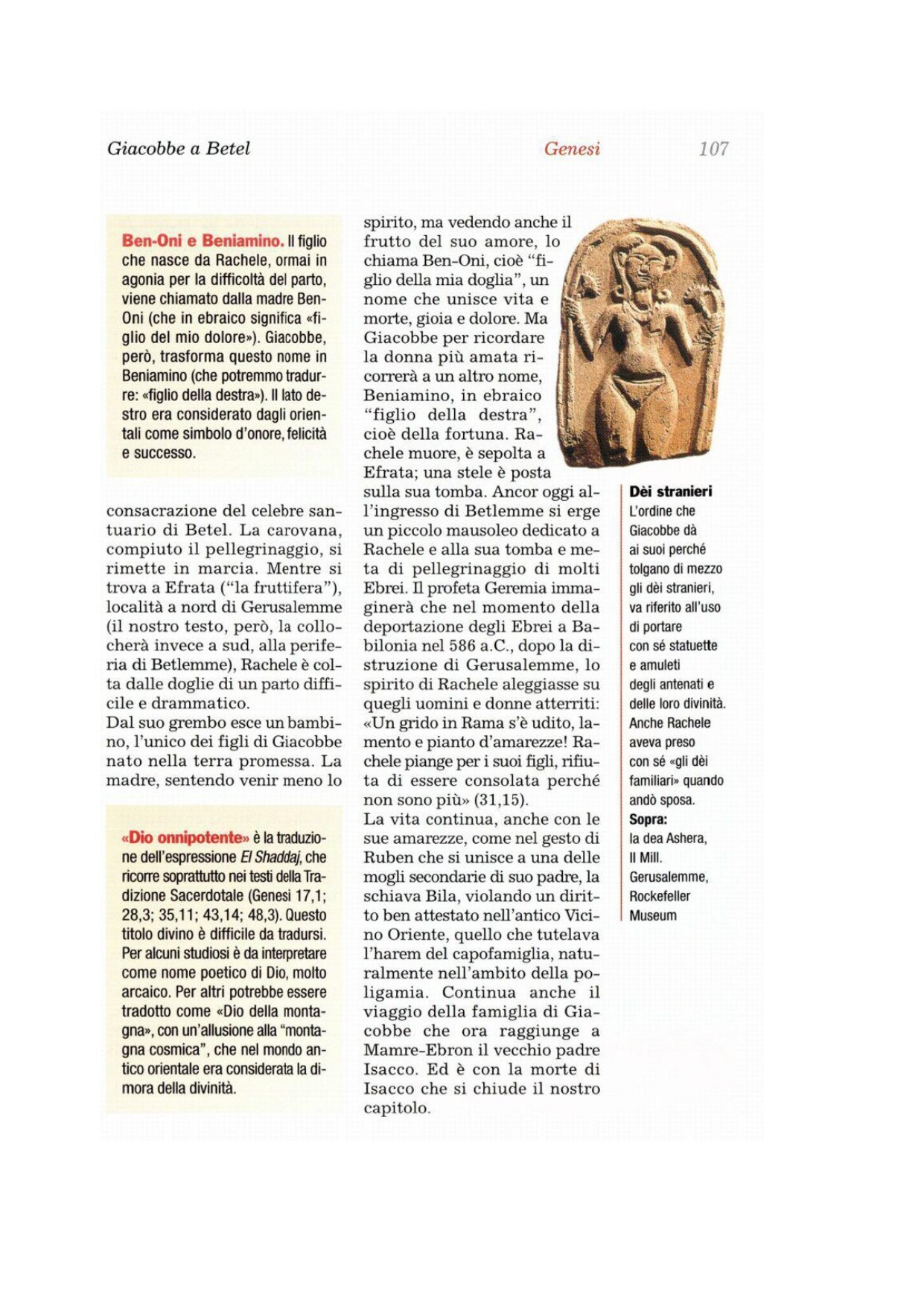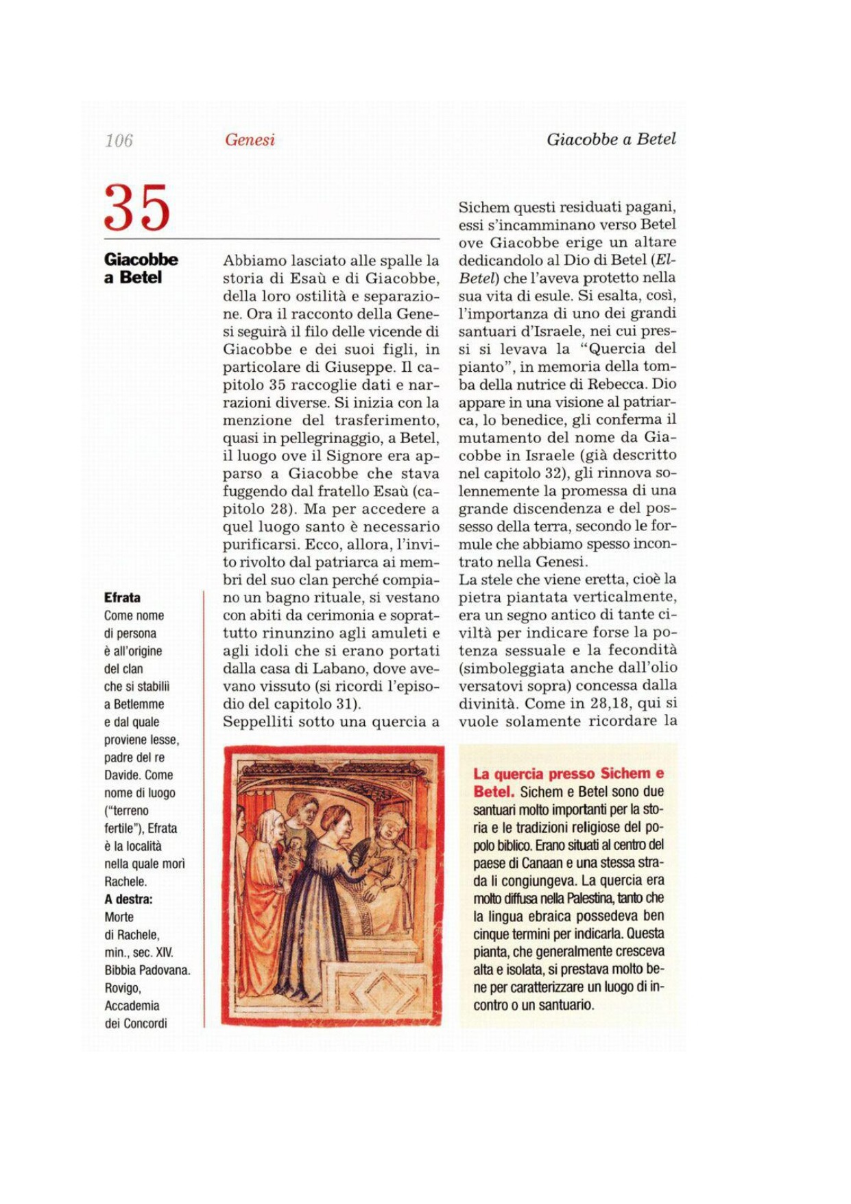 1 Dio disse a Giacobbe: «Àlzati, sali a Betel e abita là; costruisci in quel luogo un altare al Dio che ti è apparso quando fuggivi lontano da Esaù, tuo fratello». 2Allora Giacobbe disse alla sua famiglia e a quanti erano con lui: «Eliminate gli dèi degli stranieri che avete con voi, purificatevi e cambiate gli abiti. 3Poi alziamoci e saliamo a Betel, dove io costruirò un altare al Dio che mi ha esaudito al tempo della mia angoscia ed è stato con me nel cammino che ho percorso». 4Essi consegnarono a Giacobbe tutti gli dèi degli stranieri che possedevano e i pendenti che avevano agli orecchi, e Giacobbe li sotterrò sotto la quercia presso Sichem.