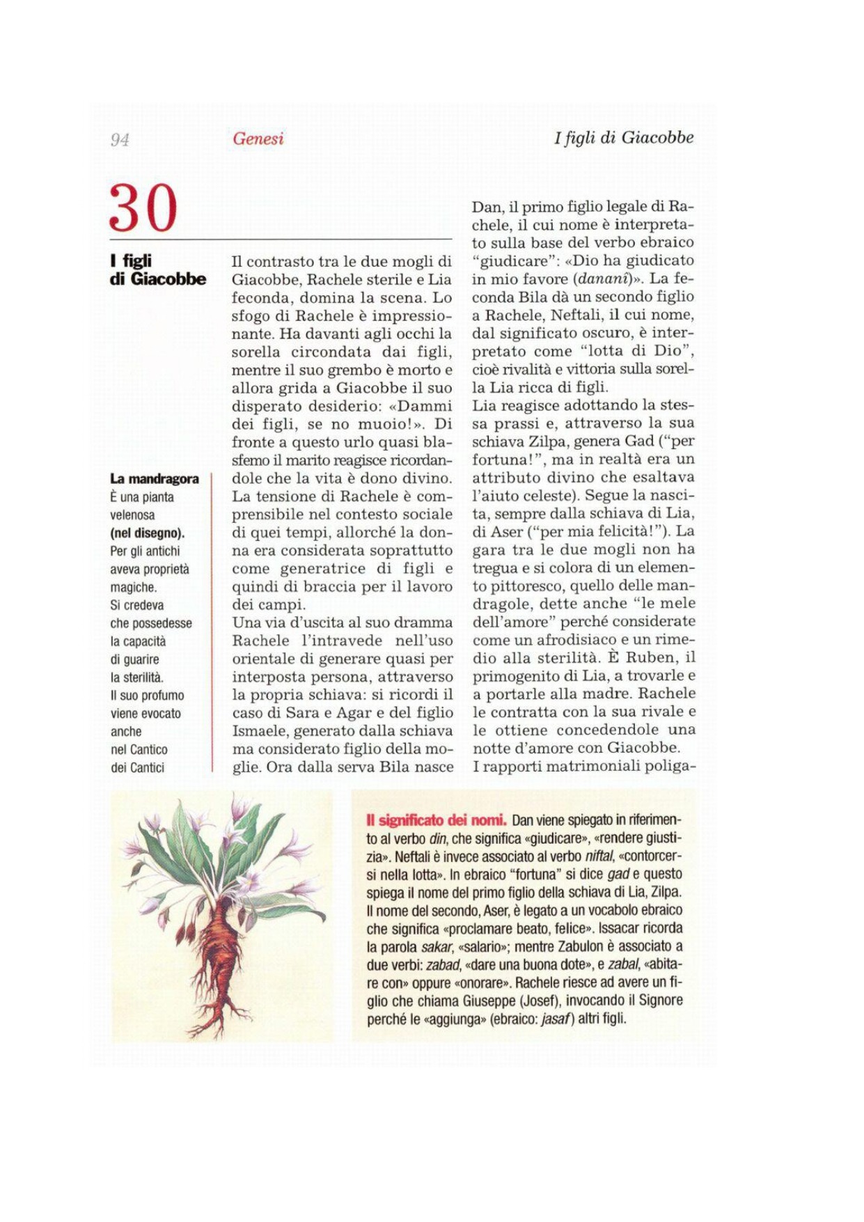 14Al tempo della mietitura del grano, Ruben uscì e trovò delle mandragore, che portò alla madre Lia. Rachele disse a Lia: «Dammi un po' delle mandragore di tuo figlio». 15Ma Lia rispose: «Ti sembra poco avermi portato via il marito, perché ora tu voglia portare via anche le mandragore di mio figlio?». Riprese Rachele: «Ebbene, Giacobbe si corichi pure con te questa notte, ma dammi in cambio le mandragore di tuo figlio». 16La sera, quando Giacobbe arrivò dalla campagna, Lia gli uscì incontro e gli disse: «Da me devi venire, perché io ho pagato il diritto di averti con le mandragore di mio figlio». Così egli si coricò con lei quella notte. 17Il Signore esaudì Lia, la quale concepì e partorì a Giacobbe un quinto figlio. 18Lia disse: «Dio mi ha dato il mio salario, perché ho dato la mia schiava a mio marito». E lo chiamò Ìssacar. 19Lia concepì e partorì ancora un sesto figlio a Giacobbe. 20Lia disse: «Dio mi ha fatto un bel regalo: questa volta mio marito mi preferirà, perché gli ho partorito sei figli». E lo chiamò Zàbulon. 21In seguito partorì una figlia e la chiamò Dina.