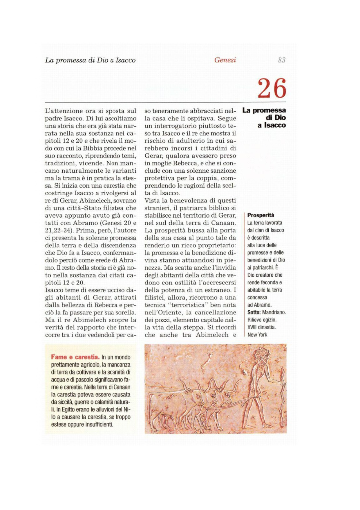 1Venne una carestia nella terra, dopo quella che c'era stata ai tempi di Abramo, e Isacco andò a Gerar presso Abimèlec, re dei Filistei. 2Gli apparve il Signore e gli disse: «Non scendere in Egitto, abita nella terra che io ti indicherò, 3rimani come forestiero in questa terra e io sarò con te e ti benedirò: a te e alla tua discendenza io concederò tutti questi territori, e manterrò il giuramento che ho fatto ad Abramo tuo padre. 4Renderò la tua discendenza numerosa come le stelle del cielo e concederò alla tua discendenza tutti questi territori: tutte le nazioni della terra si diranno benedette nella tua discendenza; 5perché Abramo ha obbedito alla mia voce e ha osservato ciò che io gli avevo prescritto: i miei comandamenti, le mie istituzioni e le mie leggi».