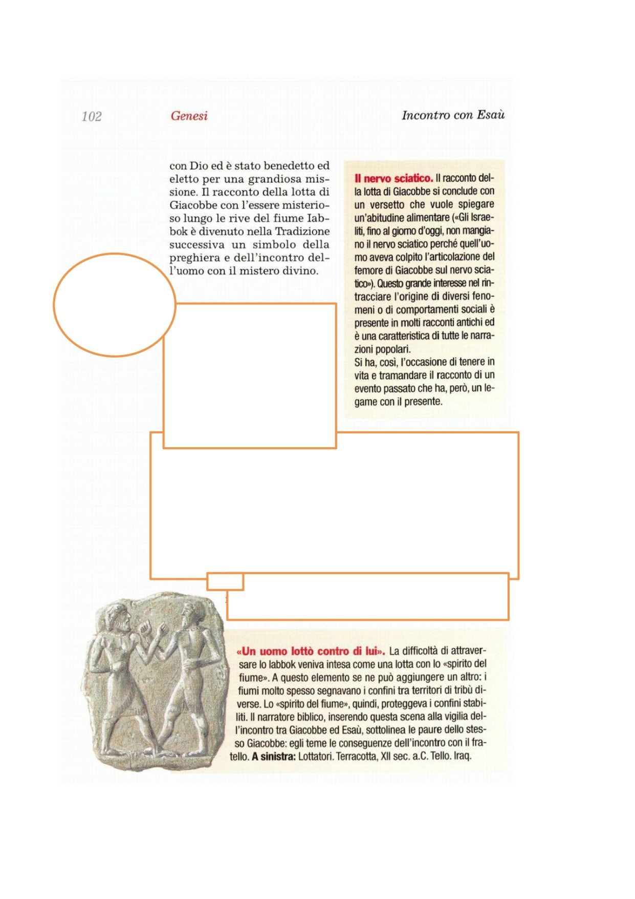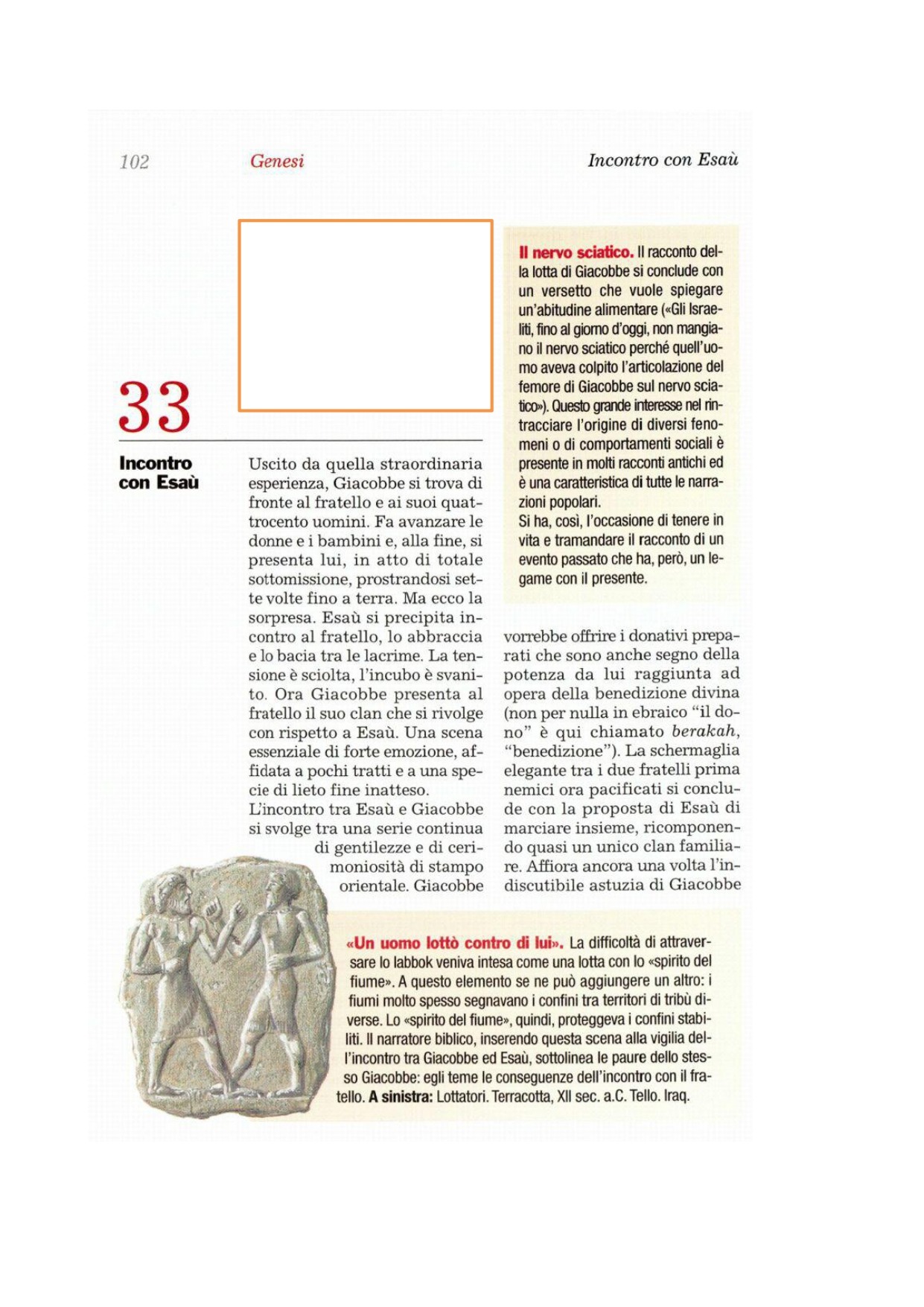 23Durante quella notte egli si alzò, prese le due mogli, le due schiave, i suoi undici bambini e passò il guado dello Iabbok. 24Li prese, fece loro passare il torrente e portò di là anche tutti i suoi averi. 25Giacobbe rimase solo e un uomo lottò con lui fino allo spuntare dell'aurora. 26Vedendo che non riusciva a vincerlo, lo colpì all'articolazione del femore e l'articolazione del femore di Giacobbe si slogò, mentre continuava a lottare con lui. 27Quello disse: «Lasciami andare, perché è spuntata l'aurora». Giacobbe rispose: «Non ti lascerò, se non mi avrai benedetto!». 28Gli domandò: «Come ti chiami?». Rispose: «Giacobbe». 29Riprese: «Non ti chiamerai più Giacobbe, ma Israele, perché hai combattuto con Dio e con gli uomini e hai vinto!». 30Giacobbe allora gli chiese: «Svelami il tuo nome». Gli rispose: «Perché mi chiedi il nome?». E qui lo benedisse. 31Allora Giacobbe chiamò quel luogo Penuèl: «Davvero - disse - ho visto Dio faccia a faccia, eppure la mia vita è rimasta salva». 32Spuntava il sole, quando Giacobbe passò Penuèl e zoppicava all'anca. 33Per questo gli Israeliti, fino ad oggi, non mangiano il nervo sciatico, che è sopra l'articolazione del femore, perché quell'uomo aveva colpito l'articolazione del femore di Giacobbe nel nervo sciatico.
