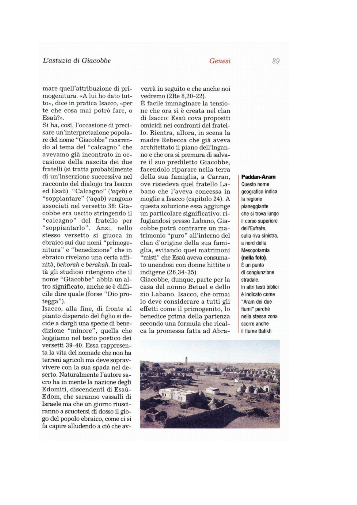 41Esaù perseguitò Giacobbe per la benedizione che suo padre gli aveva dato. Pensò Esaù: «Si avvicinano i giorni del lutto per mio padre; allora ucciderò mio fratello Giacobbe». 42Ma furono riferite a Rebecca le parole di Esaù, suo figlio maggiore, ed ella mandò a chiamare il figlio minore Giacobbe e gli disse: «Esaù, tuo fratello, vuole vendicarsi di te e ucciderti. 43Ebbene, figlio mio, dammi retta: su, fuggi a Carran da mio fratello Làbano. 44Rimarrai con lui qualche tempo, finché l'ira di tuo fratello si sarà placata. 45Quando la collera di tuo fratello con tro di te si sarà placata e si sarà dimenticato di quello che gli hai fatto, allora io manderò a prenderti di là. Perché dovrei venir privata di voi due in un solo giorno?».
