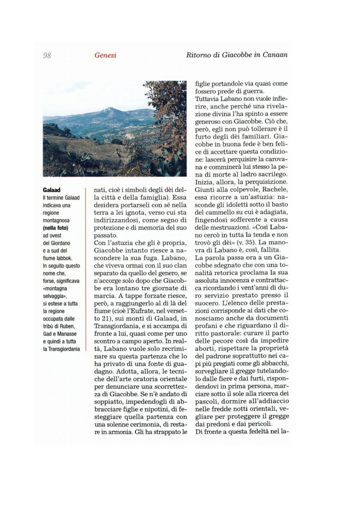 17Allora Giacobbe si alzò, caricò i figli e le mogli sui cammelli 18e condusse via tutto il bestiame e tutti gli averi che si era acquistato, il bestiame che si era acquistato in Paddan-Aram, per ritornare da Isacco, suo padre, nella terra di Canaan. 19Làbano era andato a tosare il gregge e Rachele rubò gli idoli che appartenevano al padre. 20Giacobbe eluse l'attenzione di Làbano, l'Arameo, non lasciando trapelare che stava per fuggire; 21così poté andarsene con tutti i suoi averi. Si mosse dunque, passò il Fiume e si diresse verso le montagne di Gàlaad.