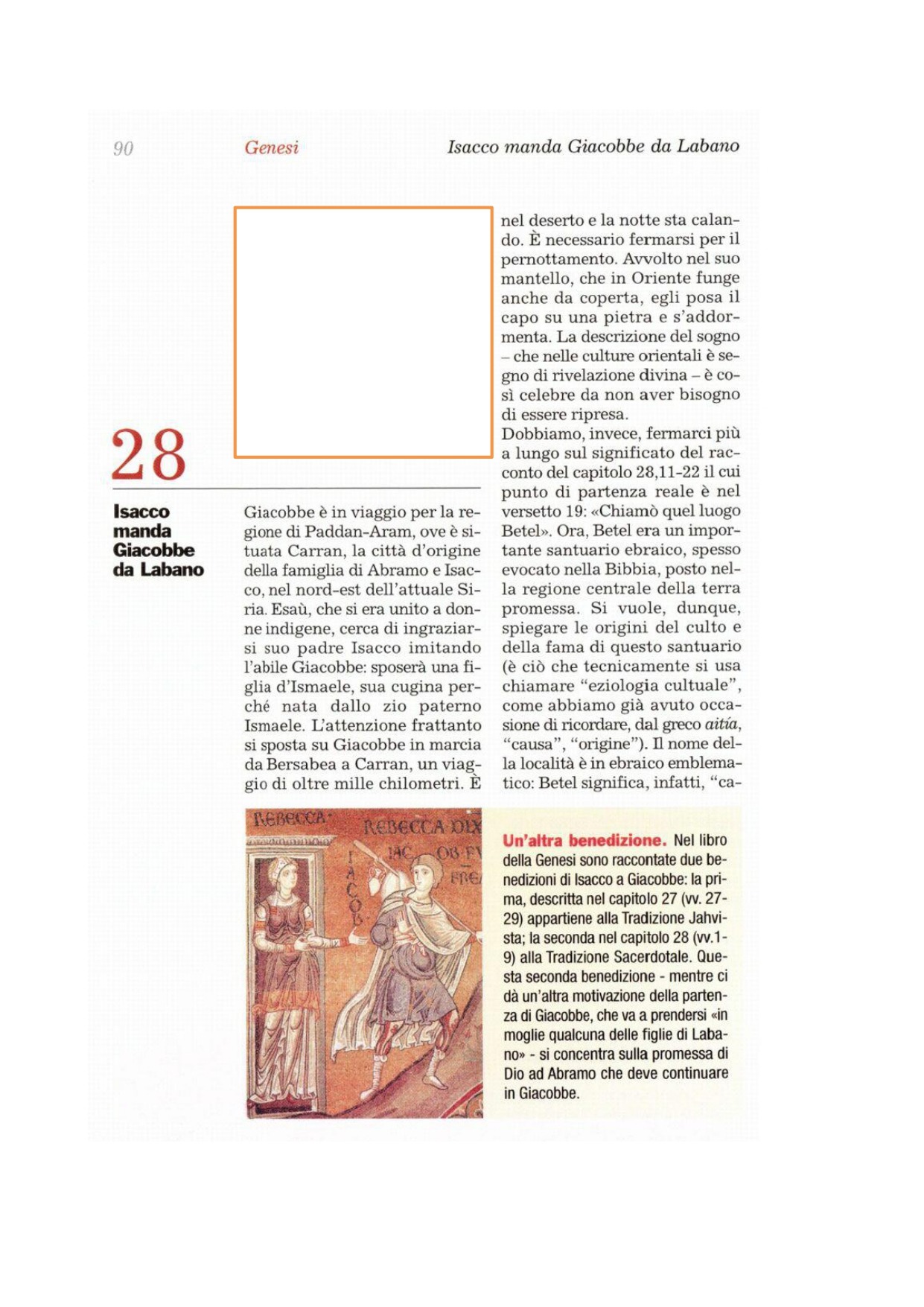 1 Allora Isacco chiamò Giacobbe, lo benedisse e gli diede questo comando: «Tu non devi prender moglie tra le figlie di Canaan. 2Su, va' in Paddan-Aram, nella casa di Betuèl, padre di tua madre, e prenditi là una moglie tra le figlie di Làbano, fratello di tua madre. 3Ti benedica Dio l'Onnipotente, ti renda fecondo e ti moltiplichi, sì che tu divenga un insieme di popoli. 4Conceda la benedizione di Abramo a te e alla tua discendenza con te, perché tu possieda la terra che Dio ha dato ad Abramo, dove tu sei stato forestiero». 5Così Isacco fece partire Giacobbe, che andò in Paddan-Aram presso Làbano, figlio di Betuèl, l'Arameo, fratello di Rebecca, madre di Giacobbe e di Esaù.
