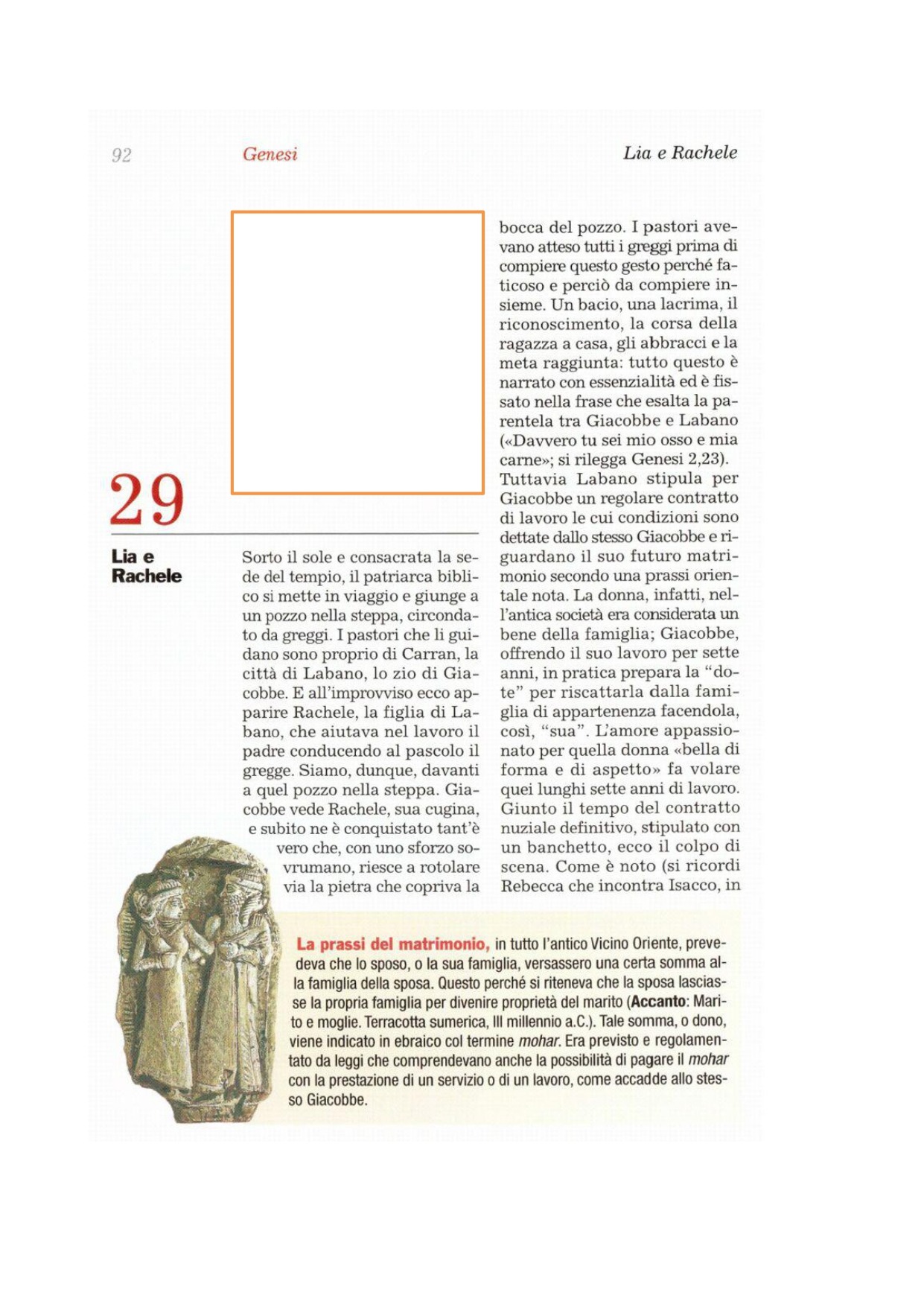 1 Giacobbe si mise in cammino e andò nel territorio degli orientali. 2Vide nella campagna un pozzo e tre greggi di piccolo bestiame distese vicino, perché a quel pozzo si abbeveravano le greggi. Sulla bocca del pozzo c'era una grande pietra: 3solo quando tutte le greggi si erano radunate là, i pastori facevano rotolare la pietra dalla bocca del pozzo e abbeveravano il bestiame; poi rimettevano la pietra al suo posto sulla bocca del pozzo. 4Giacobbe disse loro: «Fratelli miei, di dove siete?». Risposero: «Siamo di Carran». 5Disse loro: «Conoscete Làbano, figlio di Nacor?». Risposero: «Lo conosciamo». 6Poi domandò: «Sta bene?». Risposero: «Sì; ecco sua figlia Rachele che viene con il gregge». 7Riprese: «Eccoci ancora in pieno giorno: non è tempo di radunare il bestiame. Date da bere al bestiame e andate a pascolare!». 8Ed essi risposero: «Non possiamo, finché non si siano radunate tutte le greggi e si rotoli la pietra dalla bocca del pozzo; allora faremo bere il gregge».