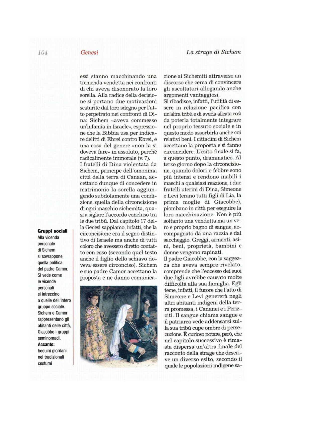 25Ma il terzo giorno, quand'essi erano sofferenti, i due figli di Giacobbe, Simeone e Levi, i fratelli di Dina, presero ciascuno la propria spada, entrarono indisturbati nella città e uccisero tutti i maschi. 26Passarono così a fil di spada Camor e suo figlio Sichem, portarono via Dina dalla casa di Sichem e si allontanarono. 27I figli di Giacobbe si buttarono sui cadaveri e saccheggiarono la città, perché quelli avevano disonorato la loro sorella. 28Presero le loro greggi e i loro armenti, i loro asini e quanto era nella città e nella campagna. 29Portarono via come bottino tutte le loro ricchezze, tutti i loro bambini e le loro donne e saccheggiarono quanto era nelle case. 30Allora Giacobbe disse a Simeone e a Levi: «Voi mi avete rovinato, rendendomi odioso agli abitanti della regione, ai Cananei e ai Perizziti. Io ho solo pochi uomini; se essi si raduneranno contro di me, mi vinceranno e io sarò annientato con la mia casa». 31Risposero: «Si tratta forse la nostra sorella come una prostituta?».