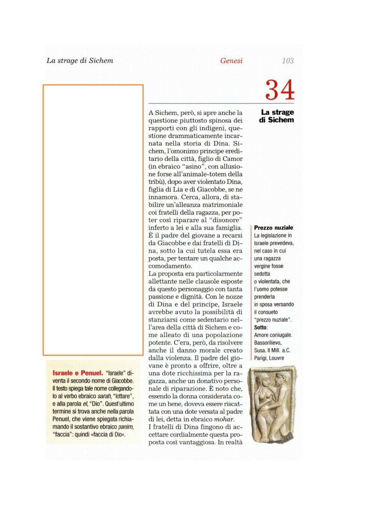 1 Dina, la figlia che Lia aveva partorito a Giacobbe, uscì a vedere le ragazze del posto. 2Ma la notò Sichem, figlio di Camor l'Eveo, principe di quel territorio, la rapì e si coricò con lei facendole violenza. 3Ma poi egli rimase legato a Dina, figlia di Giacobbe; s'innamorò della giovane e le rivolse parole di conforto. 4Quindi disse a Camor, suo padre: «Prendimi in moglie questa ragazza». 5Intanto Giacobbe aveva saputo che quello aveva disonorato sua figlia Dina, ma i suoi figli erano in campagna con il suo bestiame, e Giacobbe tacque fino al loro arrivo.
