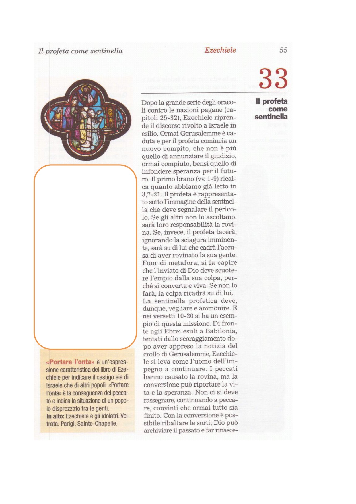 1 Mi fu rivolta questa parola del Signore: 2«Figlio dell'uomo, parla ai figli del tuo popolo e di' loro: Se mando la spada contro un paese e il popolo di quel paese prende uno di loro e lo pone quale sentinella e 3questi, vedendo sopraggiungere la spada sul paese, suona il corno e dà l'allarme al popolo, 4se colui che sente chiaramente il suono del corno non ci bada e la spada giunge e lo sorprende, egli dovrà a se stesso la propria rovina. 5Aveva udito il suono del corno, ma non vi ha prestato attenzione: sarà responsabile della sua rovina; se vi avesse prestato attenzione, si sarebbe salvato. 6Se invece la sentinella vede giungere la spada e non suona il corno e il popolo non è avvertito e la spada giunge e porta via qualcuno, questi sarà portato via per la sua iniquità, ma della sua morte domanderò conto alla sentinella. 7O figlio dell'uomo, io ti ho posto come sentinella per la casa d'Israele. Quando sentirai dalla mia bocca una parola, tu dovrai avvertirli da parte mia. 8Se io dico al malvagio: «Malvagio, tu morirai», e tu non parli perché il malvagio desista dalla sua condotta, egli, il malvagio, morirà per la sua iniquità, ma della sua morte io domanderò conto a te. 9Ma se tu avverti il malvagio della sua condotta perché si converta ed egli non si converte dalla sua condotta, egli morirà per la sua iniquità, ma tu ti sarai salvato.
