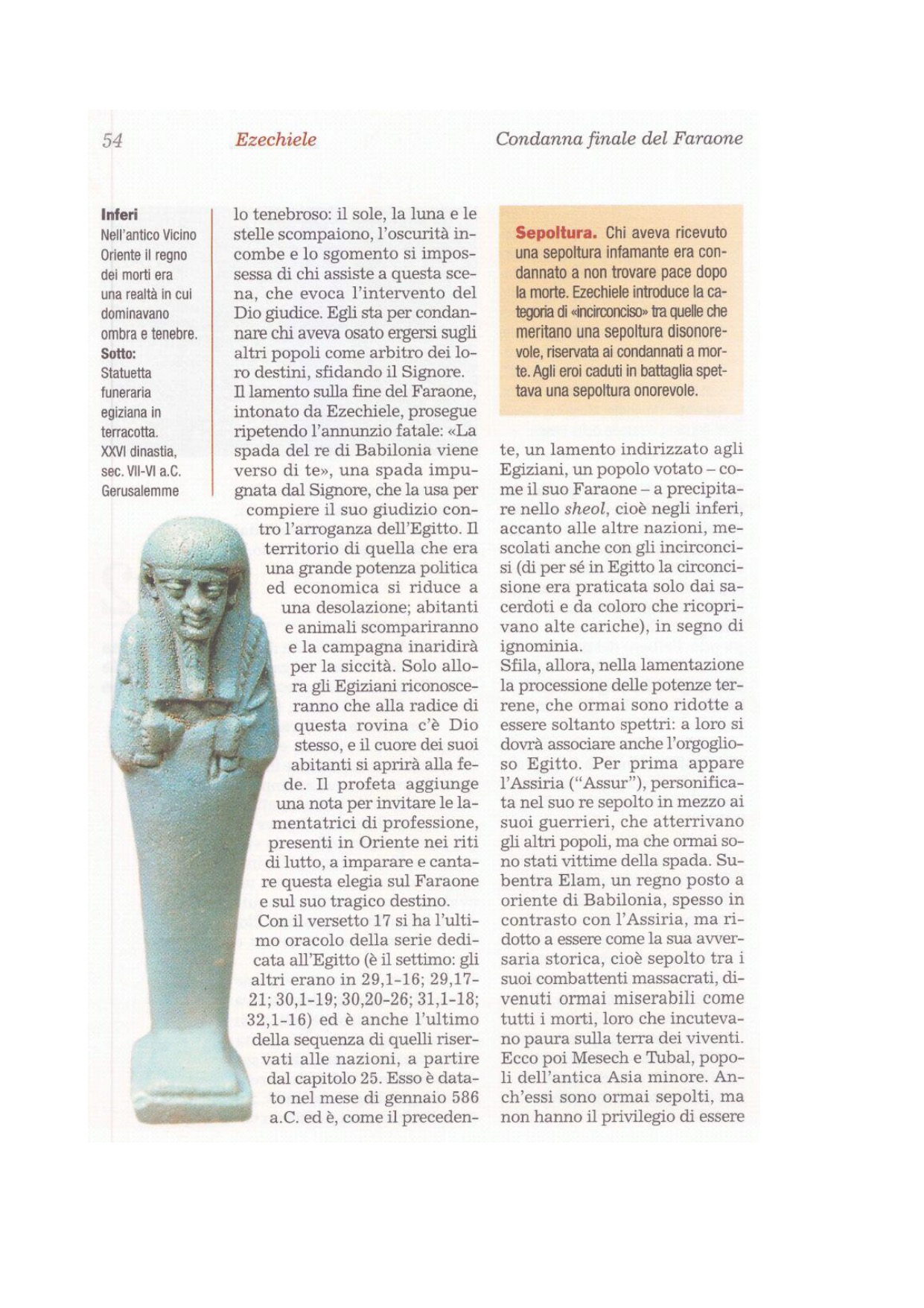 20Cadranno fra gli uccisi di spada; la spada è già consegnata. Colpite a morte l'Egitto e tutta la sua gente. 21Gli eroi più potenti si rivolgeranno a lui e ai suoi aiutanti e dagli inferi diranno: «Vieni, giaci con i non circoncisi, con i trafitti di spada». 22Là è Assur e tutta la sua gente, intorno al suo sepolcro, tutti uccisi, trafitti di spada; 23poiché le loro sepolture sono poste nel fondo della fossa e la sua gente è intorno al suo sepolcro: tutti uccisi, trafitti di spada, essi che seminavano il terrore nella terra dei viventi.