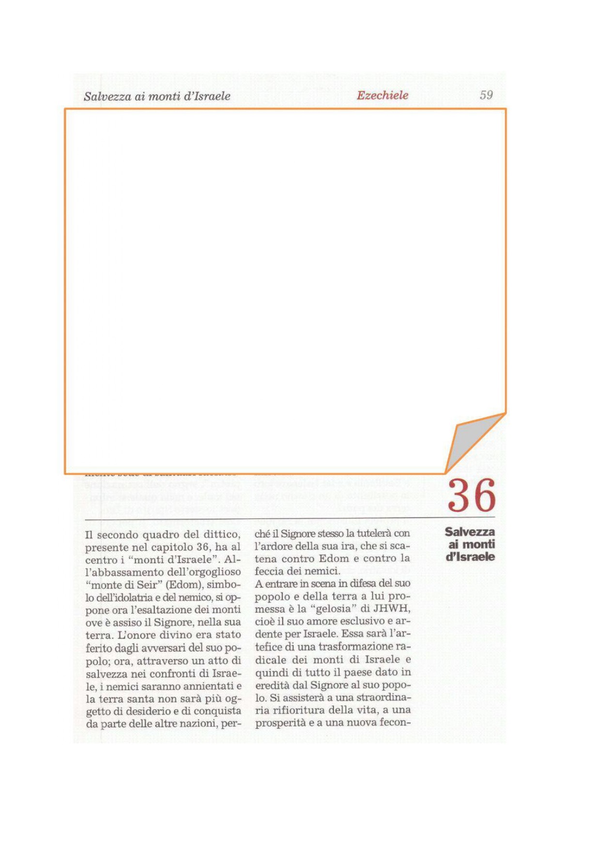 1 Ora, figlio dell'uomo, profetizza ai monti d'Israele e di': Monti d'Israele, udite la parola del Signore. 2Così dice il Signore Dio: Poiché il nemico ha detto di voi: «Bene! I colli eterni sono diventati il nostro possesso», 3ebbene, profetizza e annuncia: Così dice il Signore Dio: Poiché siete stati devastati, perseguitati dai vicini, resi possesso delle altre nazioni, e poiché siete stati fatti oggetto di maldicenza e d'insulto della gente, 4ebbene, monti d'Israele, udite la parola del Signore Dio: Così dice il Signore Dio ai monti, alle colline, alle pendici e alle valli, alle rovine desolate e alle città deserte, che furono preda e scherno delle nazioni vicine: 5ebbene, così dice il Signore Dio: Sì, con gelosia ardente io parlo contro le altre nazioni e contro tutto Edom, che con il cuore colmo di gioia e l'animo pieno di disprezzo hanno fatto del mio paese il loro possesso per saccheggiarlo. 6Per questo profetizza alla terra d'Israele e annuncia ai monti, alle colline, alle pendici e alle valli: Così dice il Signore Dio: Ecco, io parlo con gelosia e con furore; poiché voi avete sopportato l'insulto delle nazioni, 7ebbene - così dice il Signore Dio -, io alzando la mano giuro: anche le nazioni che vi stanno intorno sopporteranno il loro insulto.
