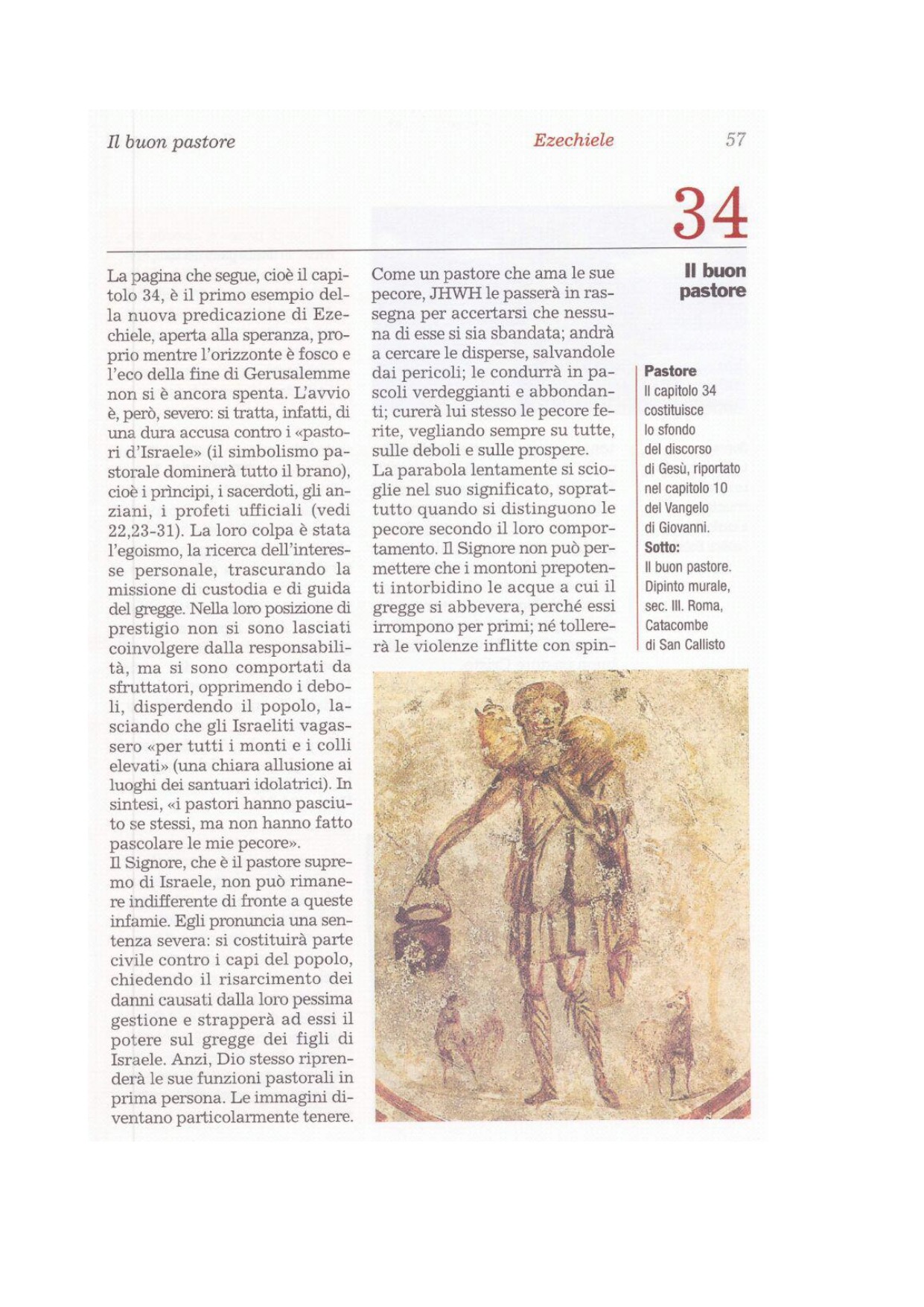1 Mi fu rivolta questa parola del Signore: 2«Figlio dell'uomo, profetizza contro i pastori d'Israele, profetizza e riferisci ai pastori: Così dice il Signore Dio: Guai ai pastori d'Israele, che pascono se stessi! I pastori non dovrebbero forse pascere il gregge? 3Vi nutrite di latte, vi rivestite di lana, ammazzate le pecore più grasse, ma non pascolate il gregge. 4Non avete reso forti le pecore deboli, non avete curato le inferme, non avete fasciato quelle ferite, non avete riportato le disperse. Non siete andati in cerca delle smarrite, ma le avete guidate con crudeltà e violenza. 5Per colpa del pastore si sono disperse e sono preda di tutte le bestie selvatiche: sono sbandate. 6Vanno errando le mie pecore su tutti i monti e su ogni colle elevato, le mie pecore si disperdono su tutto il territorio del paese e nessuno va in cerca di loro e se ne cura. 7Perciò, pastori, ascoltate la parola del Signore: 8Com'è vero che io vivo - oracolo del Signore Dio -, poiché il mio gregge è diventato una preda e le mie pecore il pasto d'ogni bestia selvatica per colpa del pastore e poiché i miei pastori non sono andati in cerca del mio gregge - hanno pasciuto se stessi senza aver cura del mio gregge -, 9udite quindi, pastori, la parola del Signore: 10Così dice il Signore Dio: Eccomi contro i pastori: a loro chiederò conto del mio gregge e non li lascerò più pascolare il mio gregge, così non pasceranno più se stessi, ma strapperò loro di bocca le mie pecore e non saranno più il loro pasto. 11Perché così dice il Signore Dio: Ecco, io stesso cercherò le mie pecore e le passerò in rassegna. 12Come un pastore passa in rassegna il suo gregge quando si trova in mezzo alle sue pecore che erano state disperse, così io passerò in rassegna le mie pecore e le radunerò da tutti i luoghi dove erano disperse nei giorni nuvolosi e di caligine. 13Le farò uscire dai popoli e le radunerò da tutte le regioni. Le ricondurrò nella loro terra e le farò pascolare sui monti d'Israele, nelle valli e in tutti i luoghi abitati della regione. 14Le condurrò in ottime pasture e il loro pascolo sarà sui monti alti d'Israele; là si adageranno su fertili pascoli e pasceranno in abbondanza sui monti d'Israele. 15Io stesso condurrò le mie pecore al pascolo e io le farò riposare. Oracolo del Signore Dio. 16Andrò in cerca della pecora perduta e ricondurrò all'ovile quella smarrita, fascerò quella ferita e curerò quella malata, avrò cura della grassa e della forte; le pascerò con giustizia.