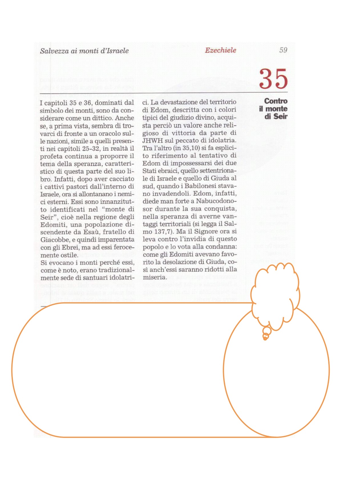 1 Mi fu rivolta questa parola del Signore: 2«Figlio dell'uomo, volgiti verso il monte Seir e profetizza contro di esso. 3Annuncerai: Così dice il Signore Dio: