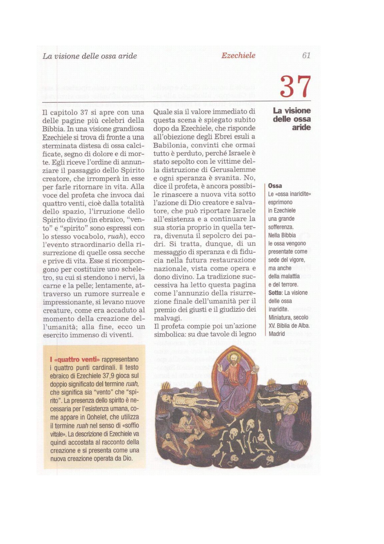 1 La mano del Signore fu sopra di me e il Signore mi portò fuori in spirito e mi depose nella pianura che era piena di ossa; 2mi fece passare accanto a esse da ogni parte. Vidi che erano in grandissima quantità nella distesa della valle e tutte inaridite. 3Mi disse: «Figlio dell'uomo, potranno queste ossa rivivere?». Io risposi: «Signore Dio, tu lo sai». 4Egli mi replicò: «Profetizza su queste ossa e annuncia loro: «Ossa inaridite, udite la parola del Signore. 5Così dice il Signore Dio a queste ossa: Ecco, io faccio entrare in voi lo spirito e rivivrete. 6Metterò su di voi i nervi e farò crescere su di voi la carne, su di voi stenderò la pelle e infonderò in voi lo spirito e rivivrete. Saprete che io sono il Signore»». 7Io profetizzai come mi era stato ordinato; mentre profetizzavo, sentii un rumore e vidi un movimento fra le ossa, che si accostavano l'uno all'altro, ciascuno al suo corrispondente. 8Guardai, ed ecco apparire sopra di esse i nervi; la carne cresceva e la pelle le ricopriva, ma non c'era spirito in loro. 9Egli aggiunse: «Profetizza allo spirito, profetizza, figlio dell'uomo, e annuncia allo spirito: «Così dice il Signore Dio: Spirito, vieni dai quattro venti e soffia su questi morti, perché rivivano»». 10Io profetizzai come mi aveva comandato e lo spirito entrò in essi e ritornarono in vita e si alzarono in piedi; erano un esercito grande, sterminato.