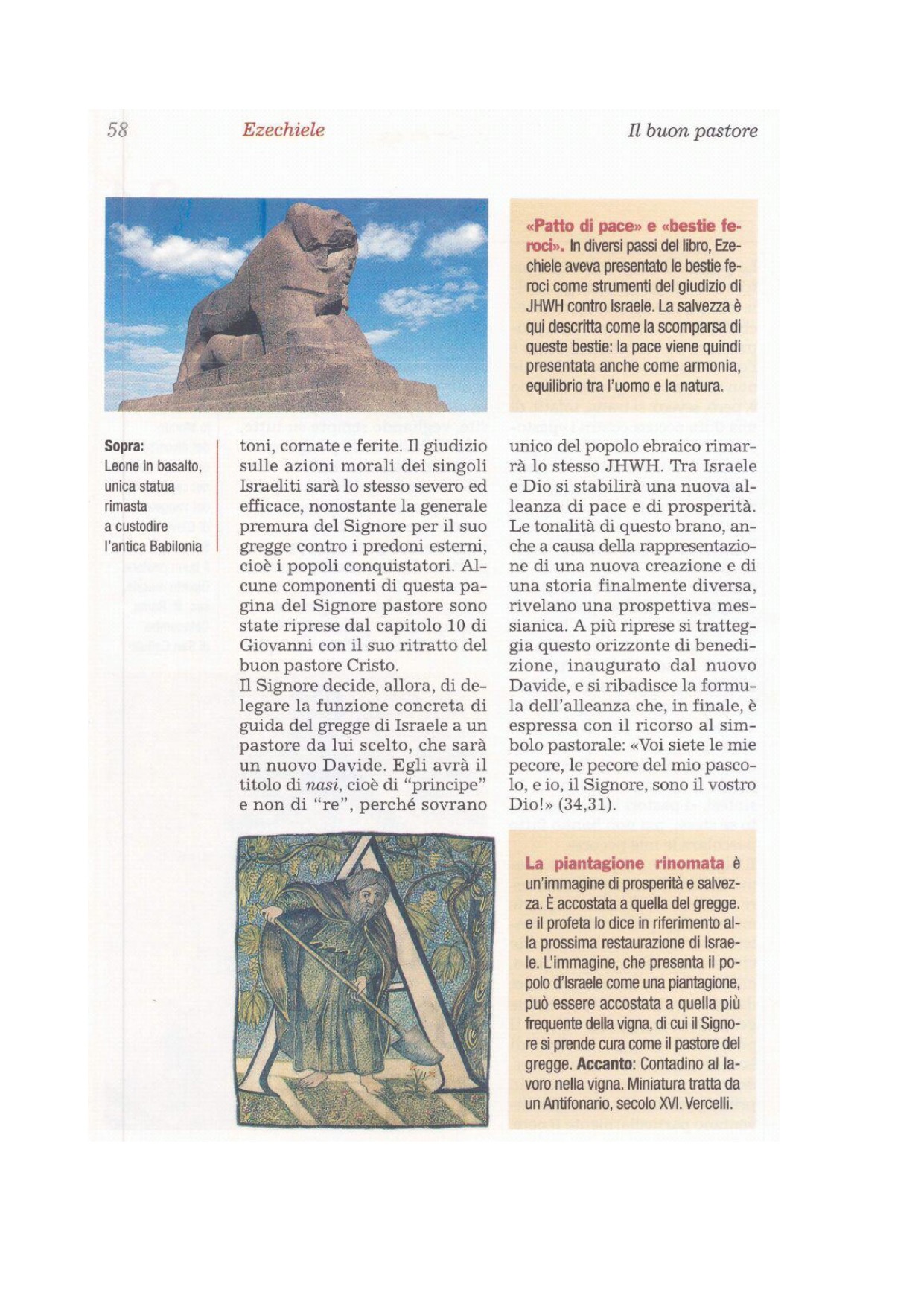 23Susciterò per loro un pastore che le pascerà, il mio servo Davide. Egli le condurrà al pascolo, sarà il loro pastore. 24Io, il Signore, sarò il loro Dio, e il mio servo Davide sarà principe in mezzo a loro: io, il Signore, ho parlato. 25Stringerò con loro un'alleanza di pace e farò sparire dal paese le bestie nocive. Abiteranno tranquilli anche nel deserto e riposeranno nelle selve.