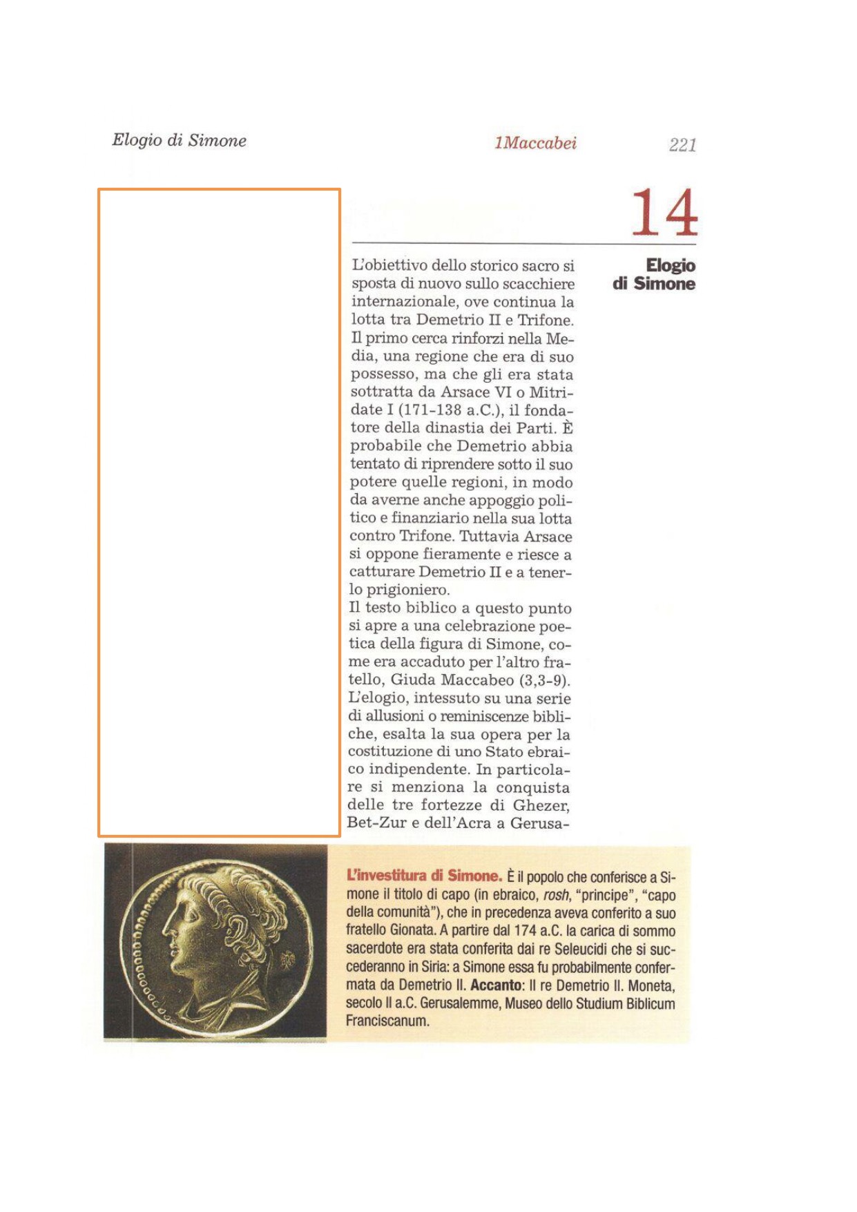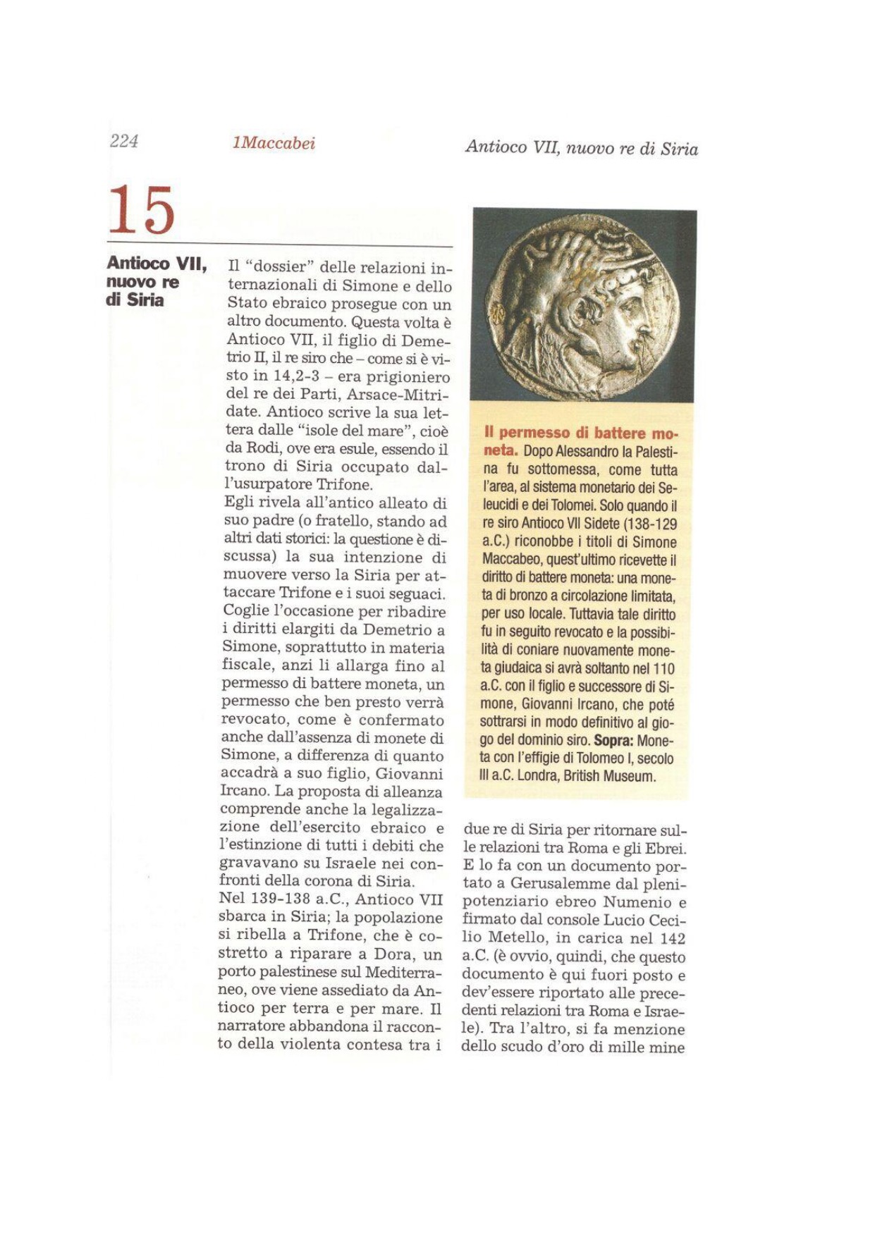 «Il re Antioco a Simone, grande sacerdote ed etnarca, e al popolo dei Giudei, salute! 3Poiché alcuni uomini pestiferi si sono impadroniti del regno dei nostri padri, voglio rivendicare i miei diritti sul regno, per ricostruirlo com'era prima; ho reclutato un esercito ingente di mercenari e allestito navi da guerra. 4È mia volontà sbarcare nella regione, per punire coloro che hanno rovinato il nostro paese e desolato molte città nel mio regno. 5Ora ti confermo tutte le esenzioni, che ti hanno concesso i re miei predecessori, e tutte le altre dispense dai doni. 6Ti concedo di battere moneta propria con corso legale al tuo paese. 7Gerusalemme e il suo santuario siano liberi; tutti gli armamenti, che hai preparato, e le fortezze che hai costruito e occupi, restino in tuo possesso. 8Quanto devi al re e i debiti che potrai avere verso il re in avvenire da ora e per sempre, ti sono rimessi. 9Quando poi avremo preso possesso del nostro regno, onoreremo te, la tua nazione e il tempio con grandi onori, così da rendere manifesta la vostra gloria in tutta la terra».