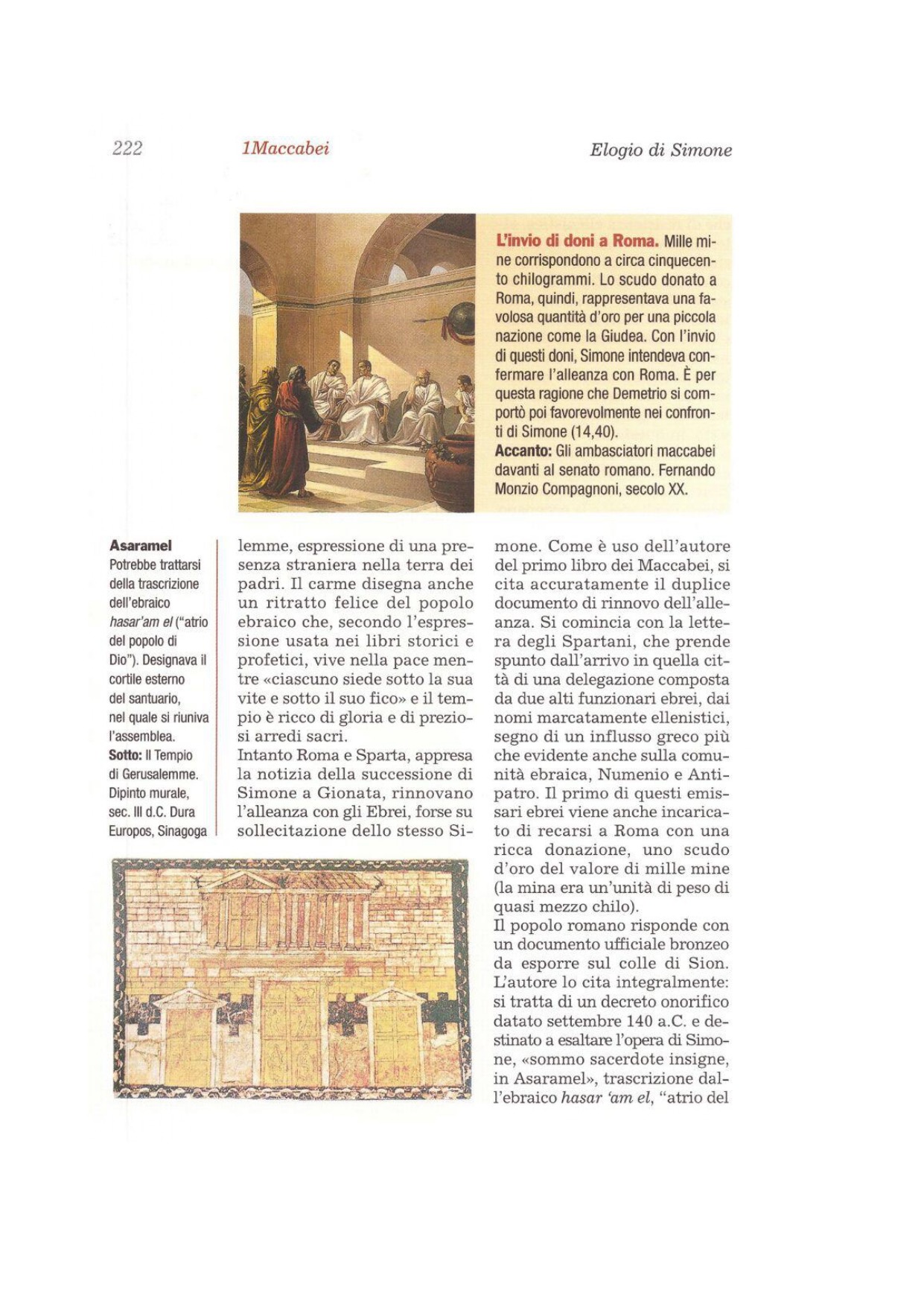 «Il diciotto di Elul dell'anno centosettantadue, che è il terzo anno di Simone, sommo sacerdote, in Asaramèl, 28nella grande assemblea dei sacerdoti e del popolo, dei capi della nazione e degli anziani della regione, ci è stato reso noto: 29Poiché più volte erano sorte guerre nel paese, Simone, figlio di Mattatia, sacerdote della stirpe di Ioarìb, e i suoi fratelli si gettarono nella mischia e si opposero agli avversari del loro popolo, perché restassero incolumi il santuario e la legge, procurando gloria grande al loro popolo. 30Giònata diede unità alla nazione, ne divenne sommo sacerdote e poi fu riunito al suo popolo. 31I loro nemici volevano invadere il loro paese e stendere la mano contro il santuario. 32Simone allora si oppose e si batté per la sua nazione, spese molto del suo per dotare di armi le milizie della sua nazione e pagò loro il salario. 33Inoltre fortificò le città della Giudea e Bet-Sur nel territorio della Giudea, dove prima c'era la roccaforte dei nemici, e vi pose un presidio di soldati giudei. 34Fortificò anche Giaffa, situata sul mare, e Ghezer presso i confini di Azoto, nelle quali prima risiedevano i nemici; vi fece abitare dei Giudei e le rifornì di quanto era necessario al loro sostentamento. 35Il popolo vide la fede di Simone e la gloria che egli si proponeva di procurare alla sua nazione; lo costituirono loro capo e sommo sacerdote per queste sue imprese e per la giustizia e la fede che egli aveva conservato al suo popolo e perché aveva cercato con ogni mezzo di elevare il suo popolo. 36Nei suoi giorni si riuscì felicemente, per suo mezzo, a scacciare dal paese le nazioni e quelli che erano nella Città di Davide e a Gerusalemme, che si erano edificati la Cittadella e ne uscivano profanando i dintorni del santuario e recando offesa grande alla sua purità. 37Egli vi insediò soldati giudei, la fortificò per la sicurezza della regione e della città ed elevò le mura di Gerusalemme. 38Il re Demetrio quindi gli confermò il sommo sacerdozio, 39lo ascrisse tra i suoi amici e gli conferì grandi onori. 40Seppe infatti che i Giudei erano considerati amici, alleati e fratelli da parte dei Romani, e che questi erano andati incontro ai messaggeri di Simone con segni di onore, 41che i Giudei e i sacerdoti avevano approvato che Simone fosse sempre loro condottiero e sommo sacerdote finché non sorgesse un profeta fedele, 42che fosse loro stratega e avesse cura del santuario e fossero nominati da lui i sovrintendenti ai lavori, al paese, agli armamenti e alle fortezze, 43che si prendesse cura del santuario, fosse da tutti obbedito e si scrivessero nel suo nome tutti i contratti del paese e vestisse di porpora e ornamenti d'oro. 44Non dovrà essere lecito a nessuno del popolo né dei sacerdoti respingere alcuno di questi diritti o disobbedire ai suoi ordini o convocare riunioni senza il suo consenso e vestire di porpora e ornarsi della fibbia d'oro; 45chiunque agirà contro questi decreti o ne respingerà qualcuno, sarà ritenuto colpevole. 46Piacque a tutto il popolo sancire che Simone si comportasse secondo questi decreti. 47Simone da parte sua accettò e gradì di esercitare il sommo sacerdozio, di essere anche stratega ed etnarca dei Giudei e dei sacerdoti e capo di tutti».