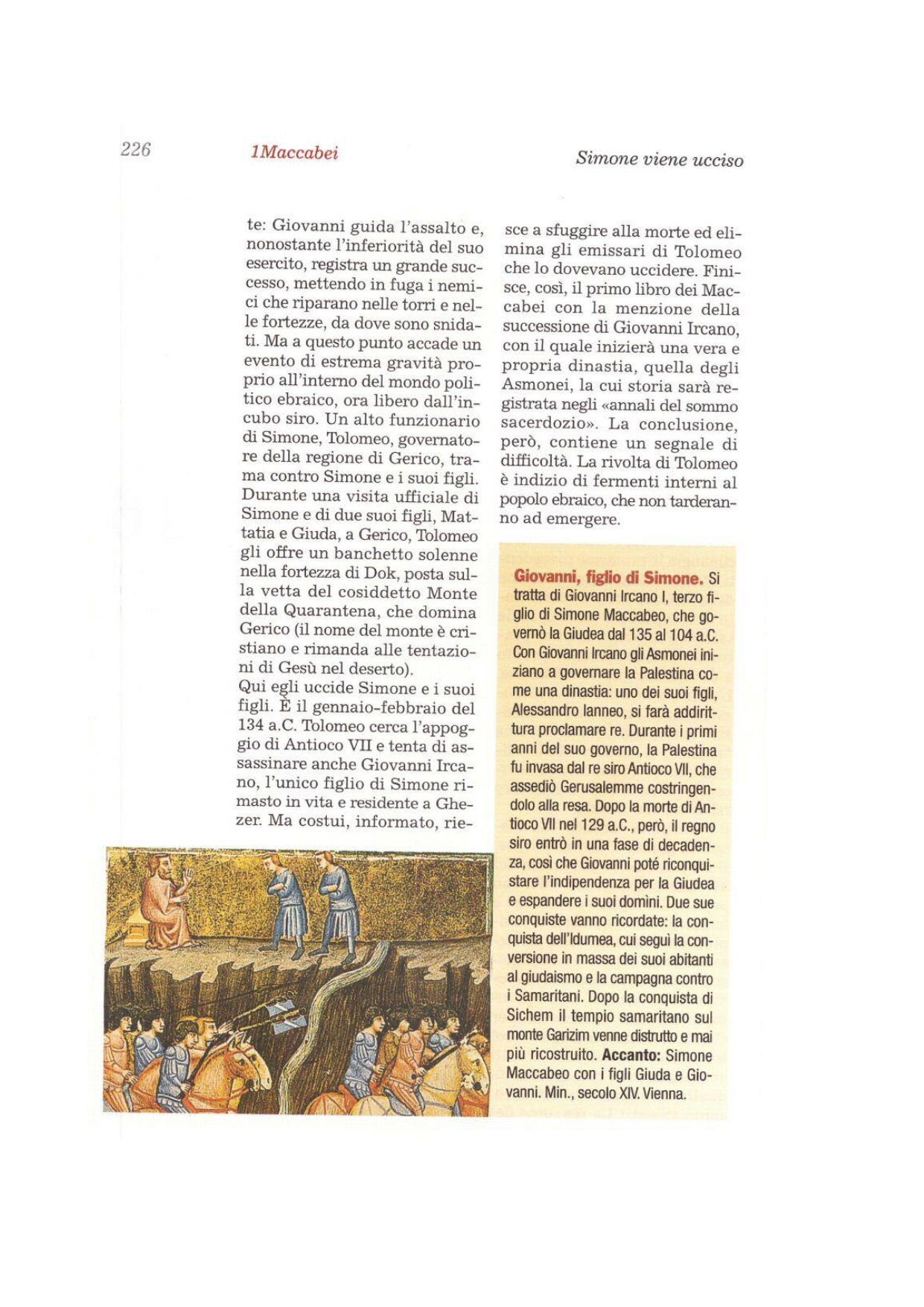 18Tolomeo poi scrisse un rapporto di queste cose e lo inviò al re, perché gli mandasse milizie in aiuto e gli desse in consegna la loro regione e le città. 19Inviò altri uomini a Ghezer per eliminare Giovanni e spedì lettere ai suoi comandanti, che venissero da lui, perché voleva dare loro argento, oro e doni; 20altri infine inviò a occupare Gerusalemme e il monte del tempio. 21Ma qualcuno corse avanti e informò Giovanni, a Ghezer, che suo padre e i suoi fratelli erano morti, aggiungendo: «Ha inviato uomini per uccidere anche te». 22Udendo ciò, Giovanni rimase profondamente costernato; catturò gli uomini inviati per sopprimerlo, e li mise a morte. Aveva infatti saputo che cercavano di ucciderlo.